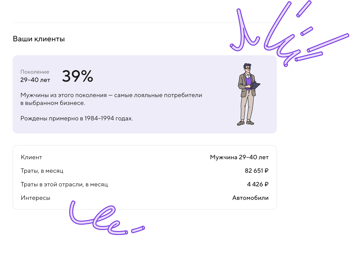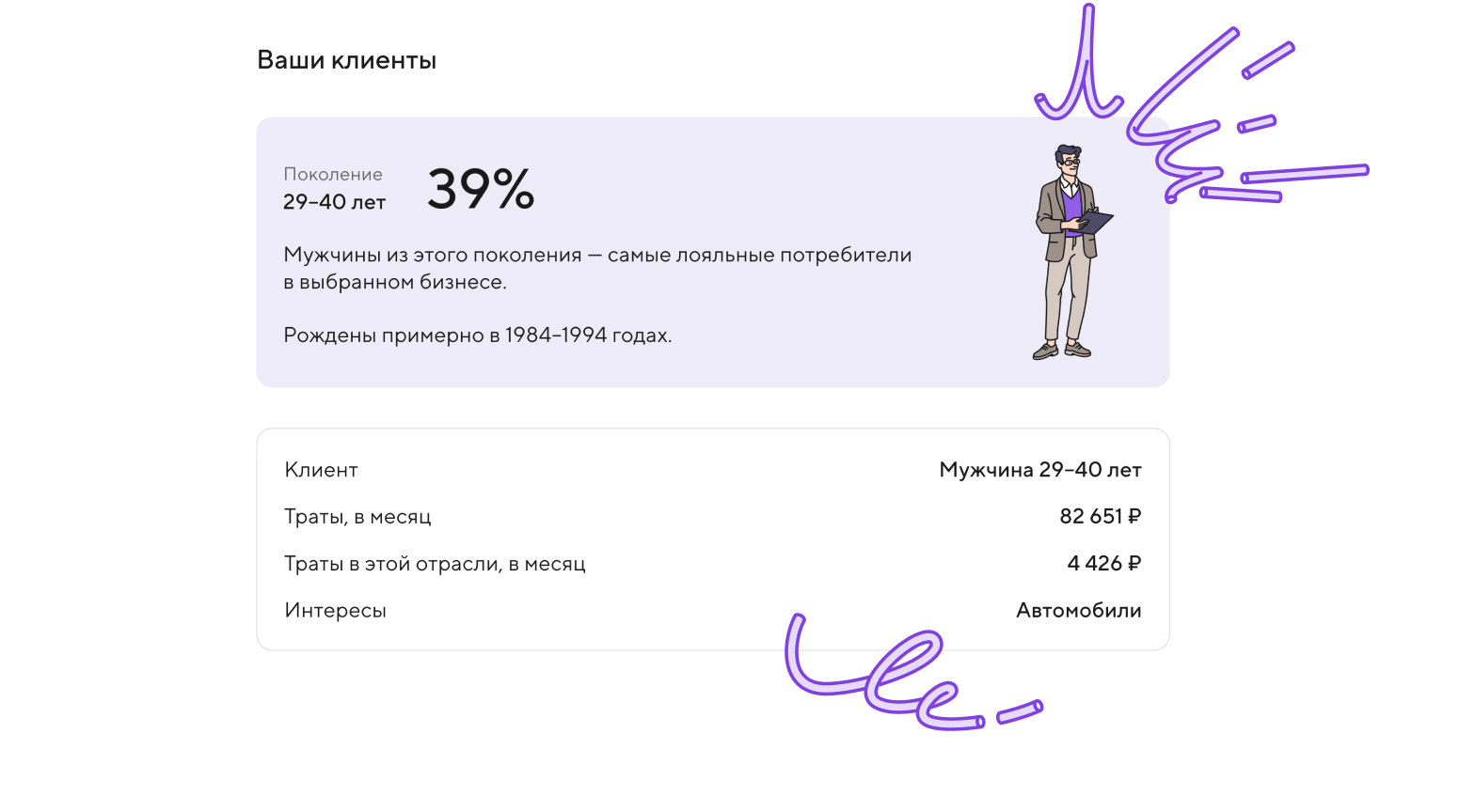 В отчёте вы увидите портрет аудитории, которая с наибольшей вероятностью заинтересована в ваших товарах и услугах, и получите рекомендации по продажам. Отчёт носит рекомендательный характер и не является призывом к действию.