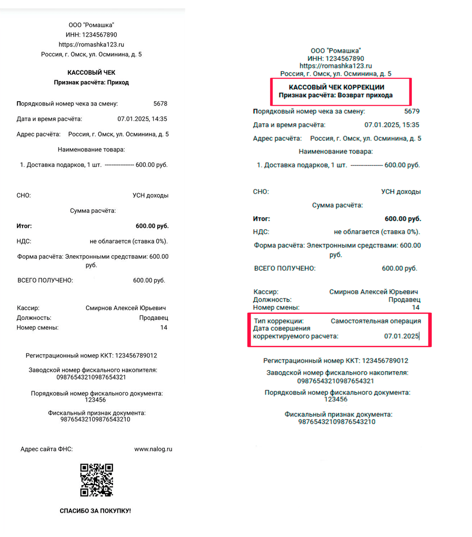 Приведём пример, чем различаются кассовый чек и чек коррекции: