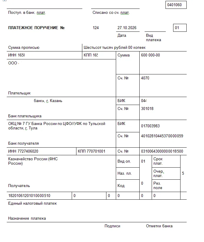- Получатель: Казначейство России (ФНС России).