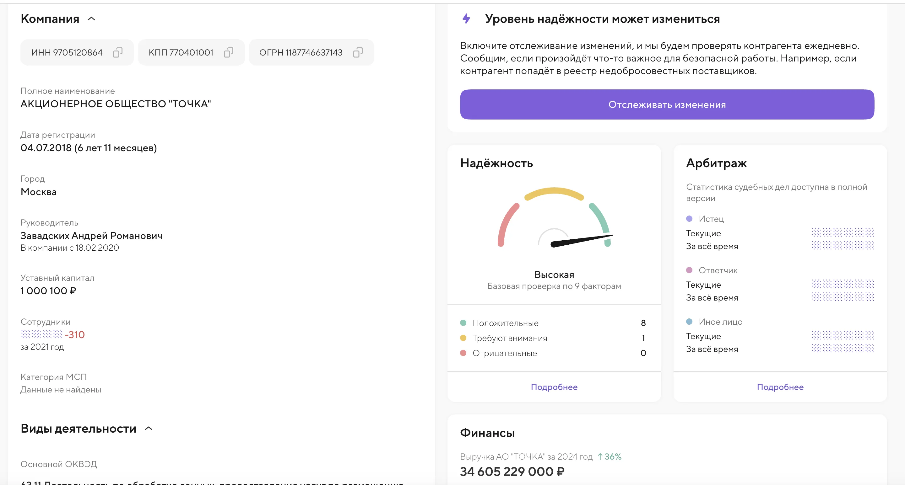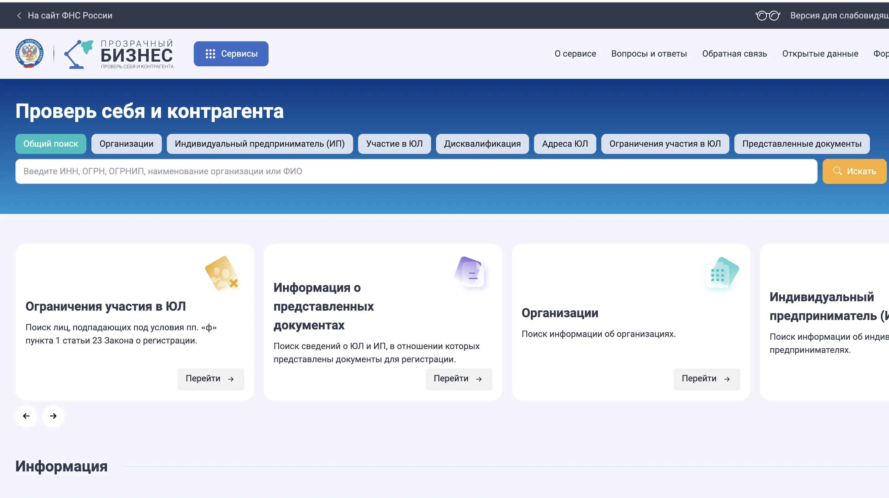 В сервисе налоговой «Прозрачный бизнес» введите ИНН, ФИО или название компании. В карточке организации обратите внимание на: