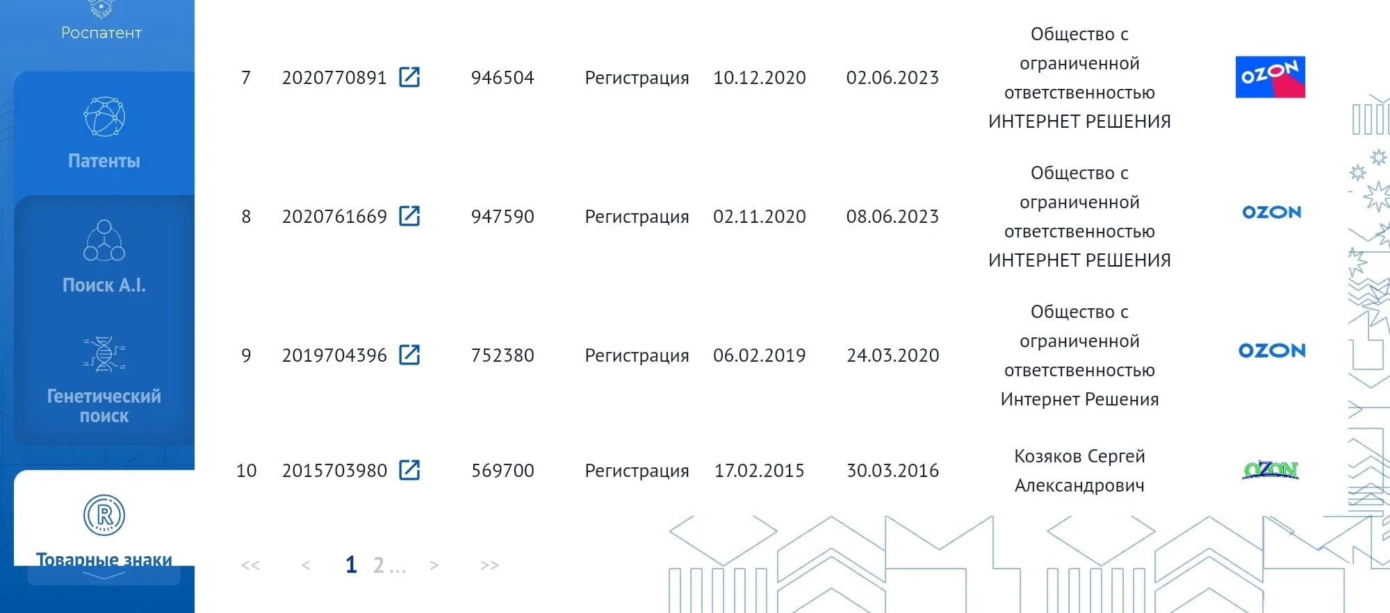 В реестре Роспатента зарегистрированы разные варианты товарного знака Ozon от ООО «Интернет Решения», а также знак с таким же названием от Козякова Сергея Александровича. Под этим знаком Сергей Александрович продаёт дизельное топливо.