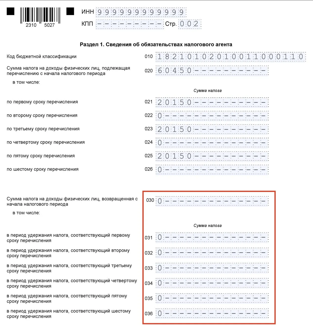 - В строке 030 отражается общая сумма возврата НДФЛ.