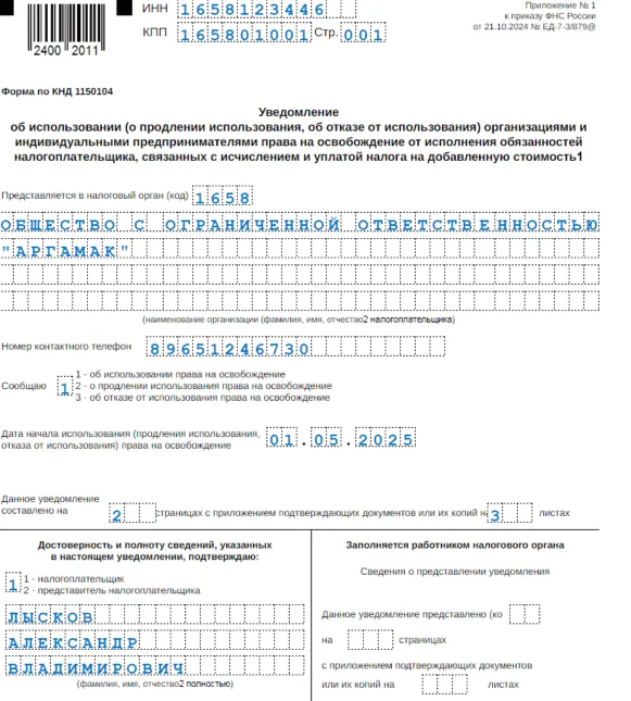 Образец уведомления об освобождении от НДС на ОСН