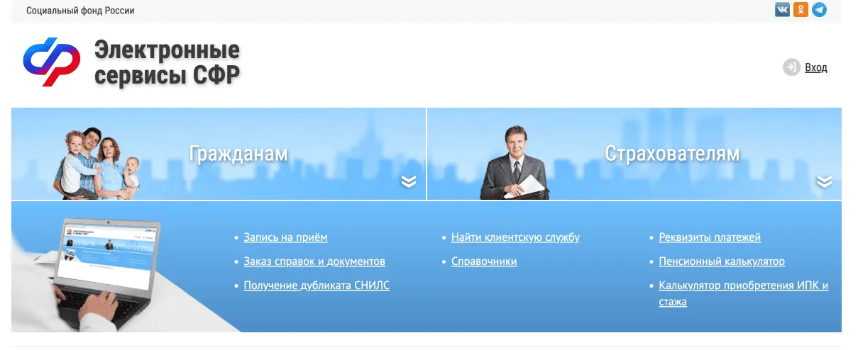 Личный кабинет гражданина и страхователя доступен по прямой ссылке. Раздел «Гражданам» нужен, чтобы подать заявление на пособие, получить справки и выписки. Раздел «Страхователям» позволяет работодателям подать отчёт о страховании в электронном виде без посещения СФР.