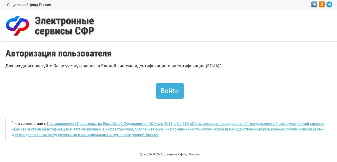 После очередного нажатия на «Войти» вам понадобится ввести логин и пароль от Госуслуг, после чего вам придёт SMS с кодом для входа в личный кабинет СФР. Сайт будет запрашивать код каждый раз при входе в личный кабинет.