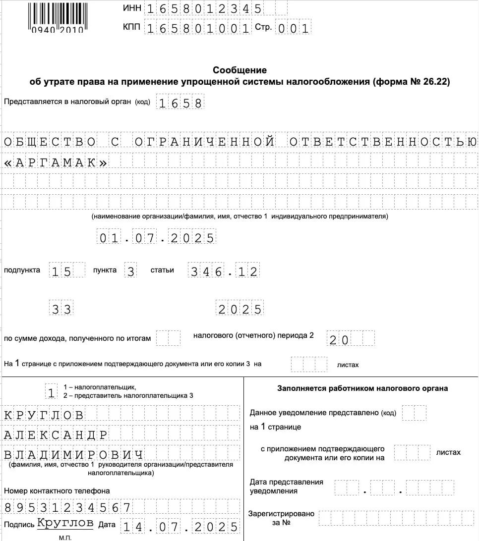 Пример заполнения титульного листа об утрате права на УСН