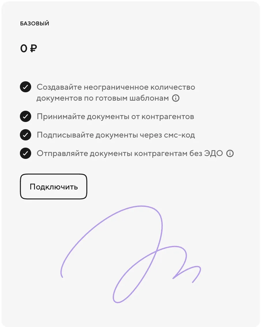 - Возможность отправлять документы без КЭП, в бесплатном тарифе через НЭП.