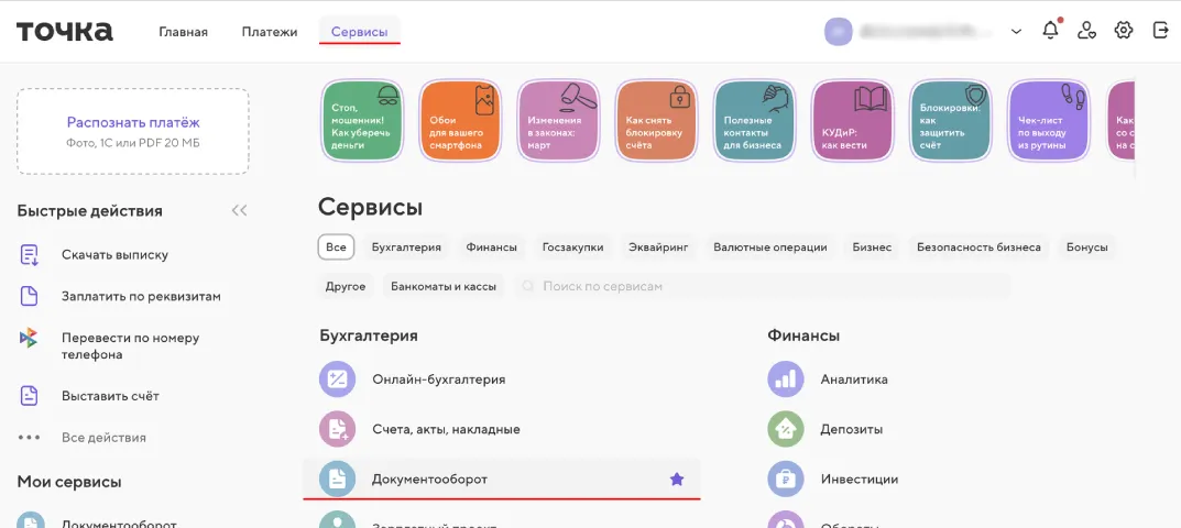 1. В личном кабинете зайдите во вкладку «Сервисы», а затем выберете «Документооборот».