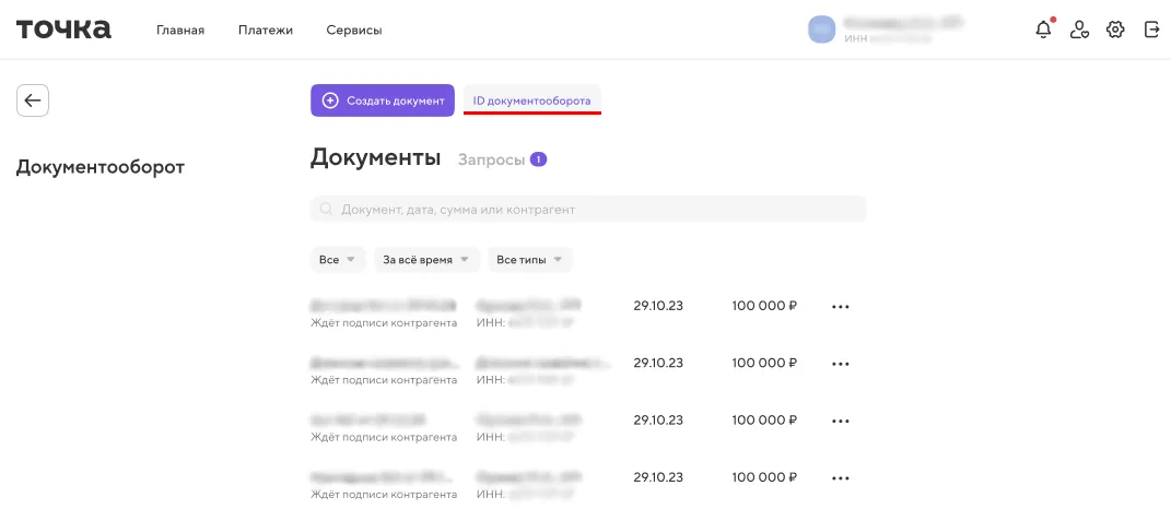Но в некоторых системах электронного документооборота требуется указывать именно ID в ЭДО. Как посмотреть идентификатор ЭДО? Обычно он хранится в личном кабинете сервиса оператора. Если у вас есть расчётный счёт в Точке, то свой код вы найдёте в разделе «Мои сервисы» → «Документооборот», по кнопке «ID документооборота».