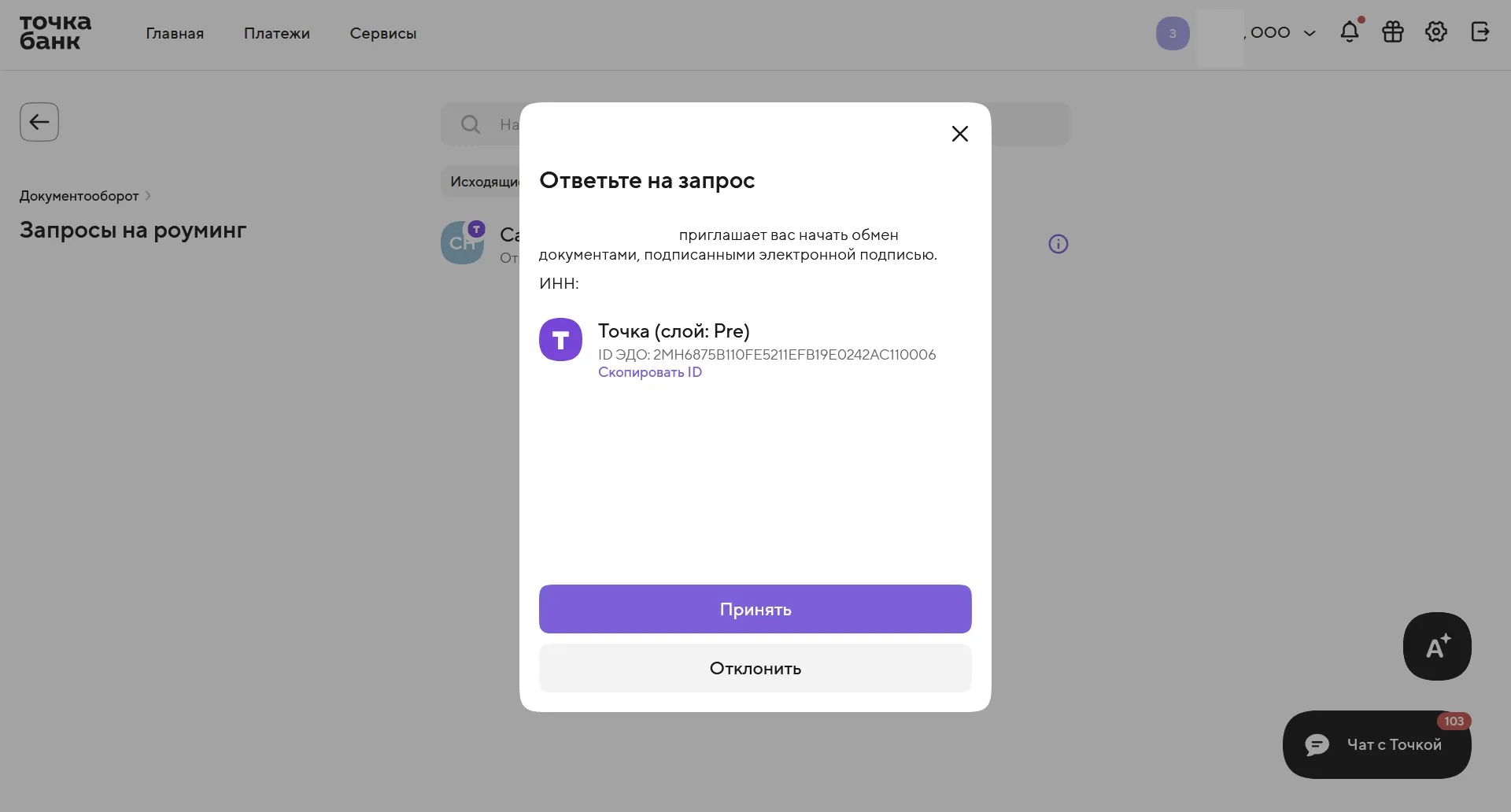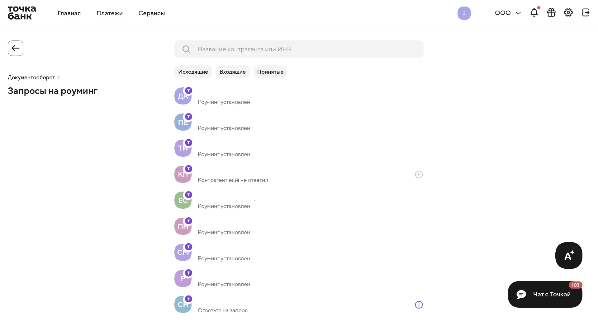 - Откройте список входящих приглашений. Например в ЭДО от Точка Банк это раздел «Сервисы» → «Документооборот» → «Настройки» → «Запросы на роуминг».
