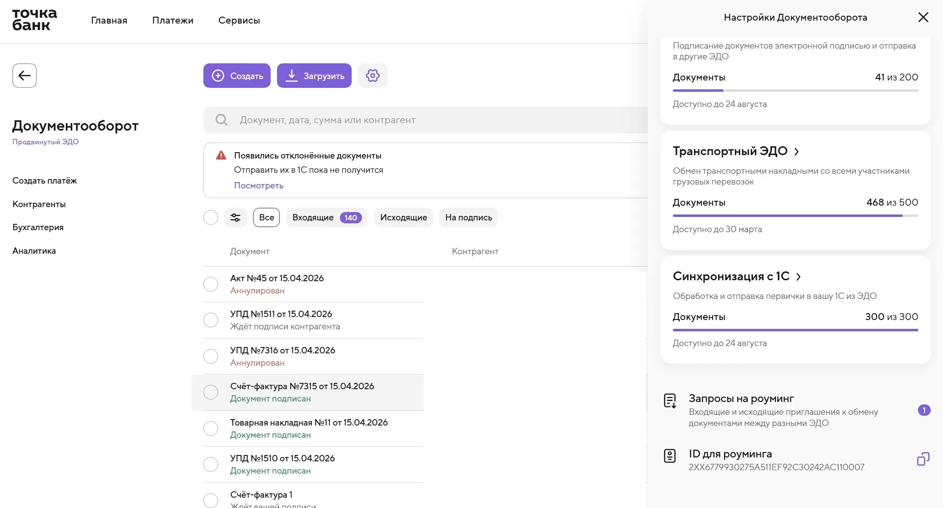 Если вы только начинаете работать с ЭДО, разумно выбрать готовое решение без сложной настройки — например, сервис ЭДО от Точка Банк, уже встроенный в интернет‑банк и позволяющий быстро приступить к обмену документами. В системе достаточно указать ИНН клиента — после этого она автоматически отобразит все его учётные записи в ЭДО.