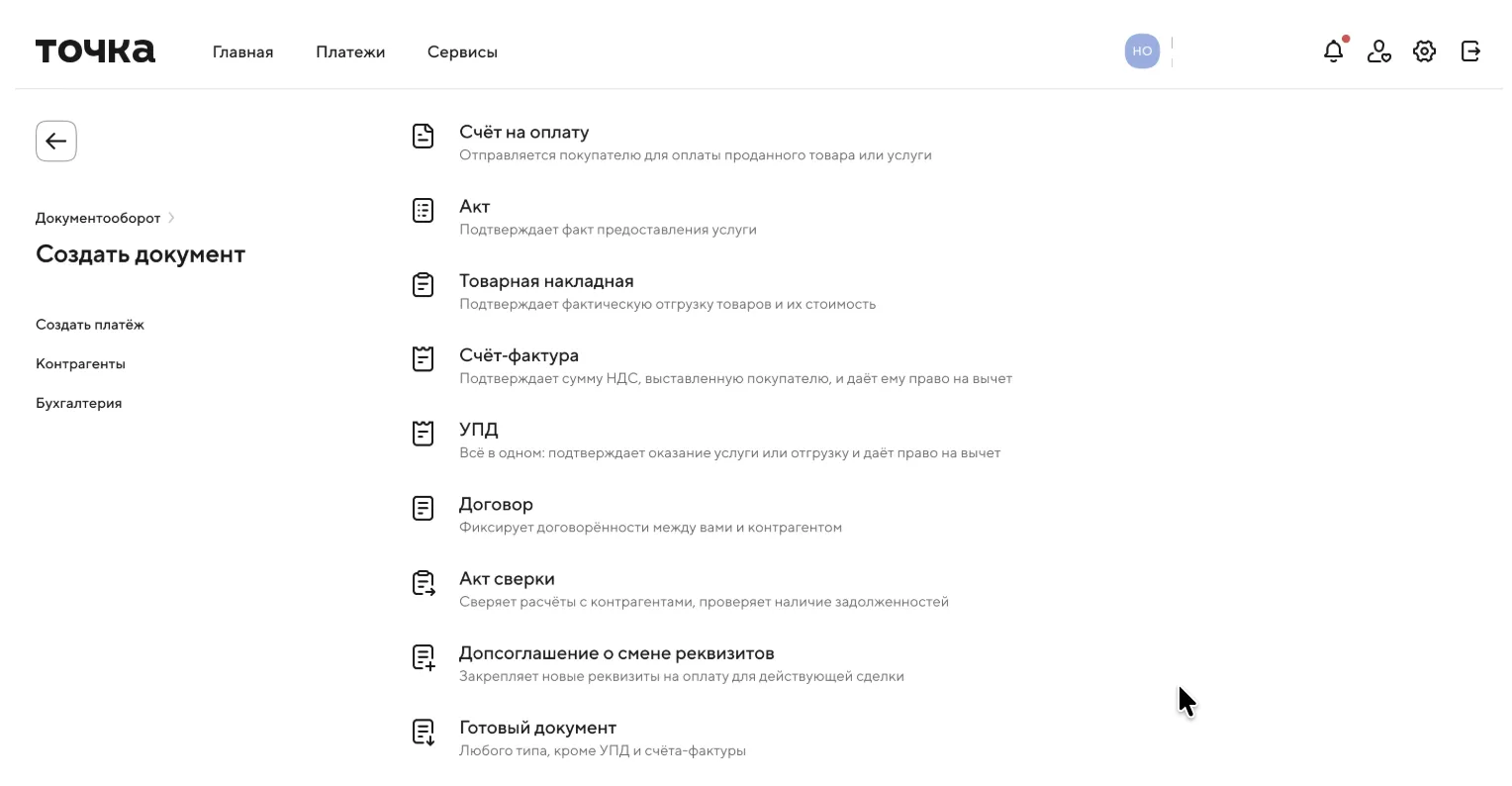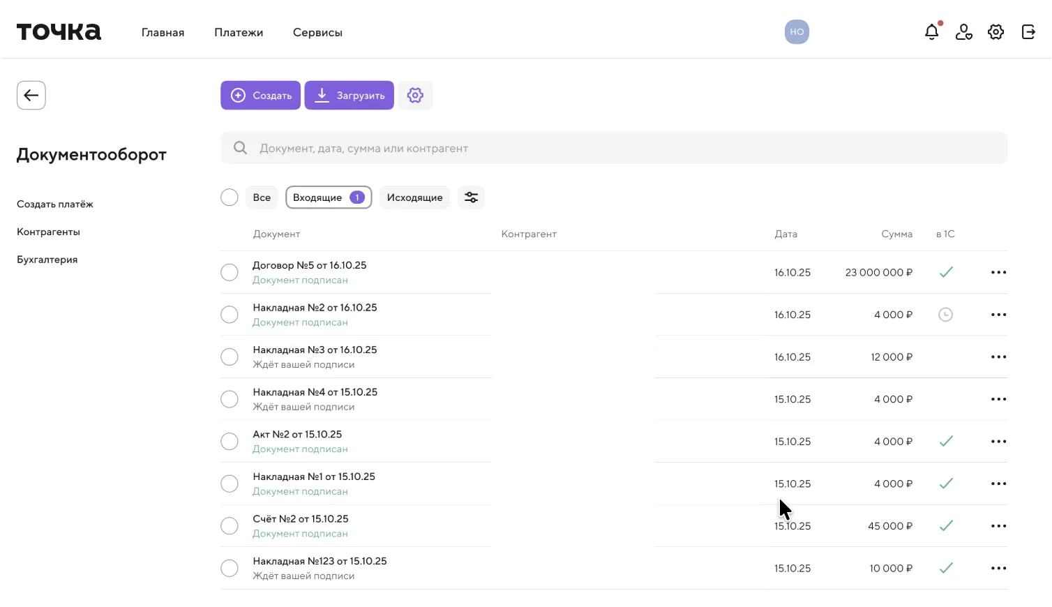 В ЭДО от Точка Банк реквизиты вашей компании и контрагентов подставляются автоматически, а система сама формирует номер документа, рассчитывает цену и итоговую сумму. Это снижает риск ошибок по сравнению с ручным заполнением.