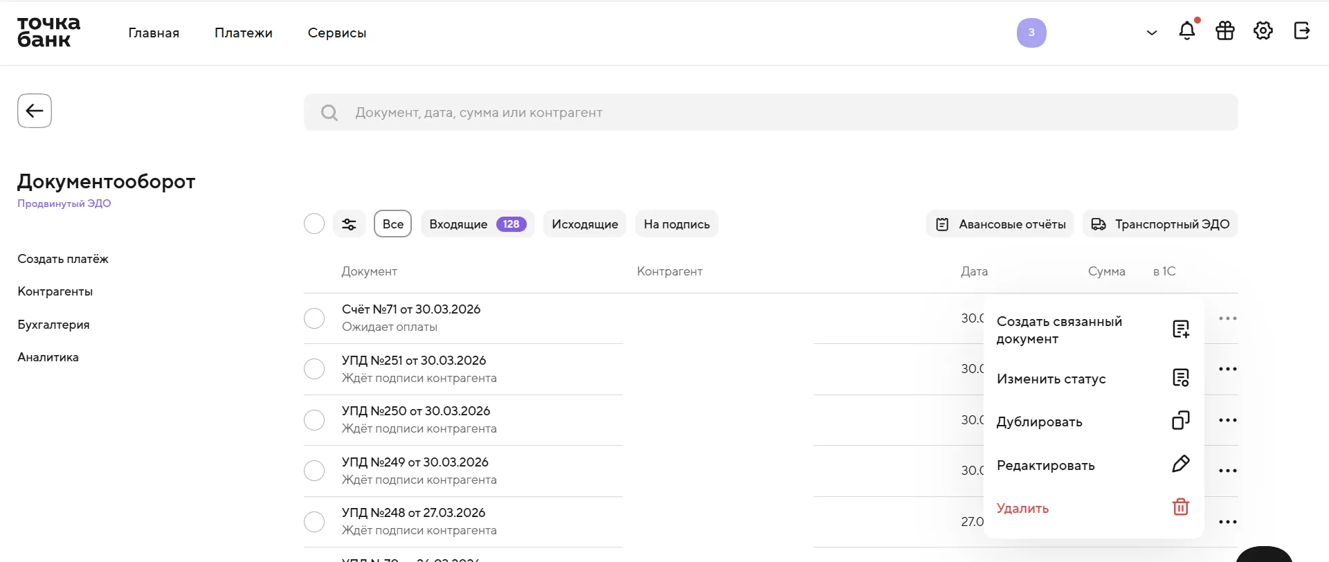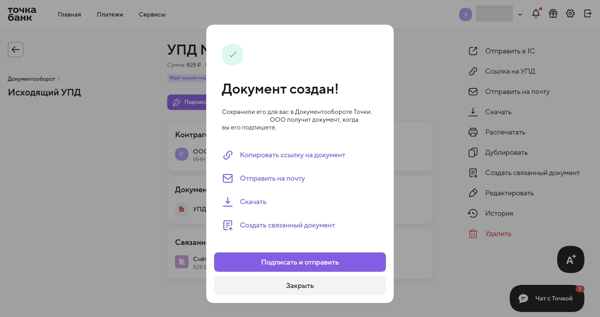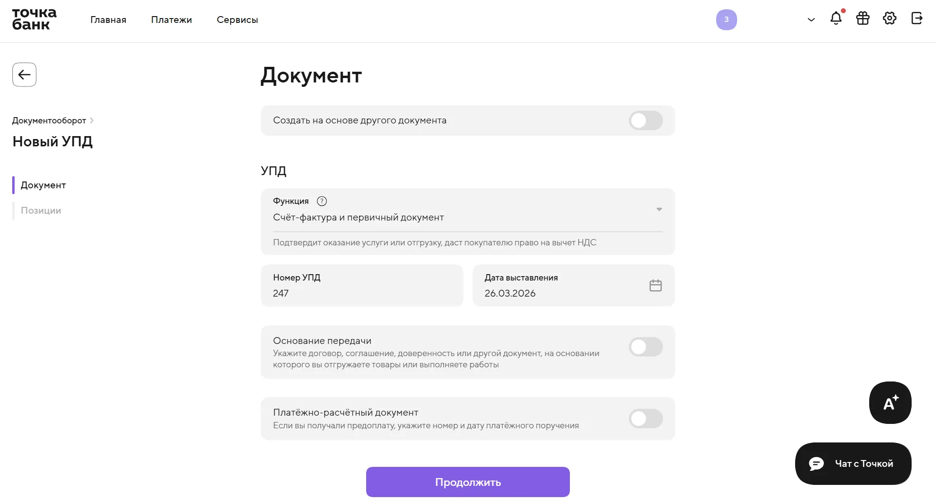 Например, в ЭДО от Точка Банк можно быстро создать, подписать и отправить УПД — сервис сам заполнит реквизиты, рассчитает суммы и сохранит документы. Это экономит время и снижает риск ошибок в учёте.
