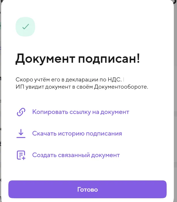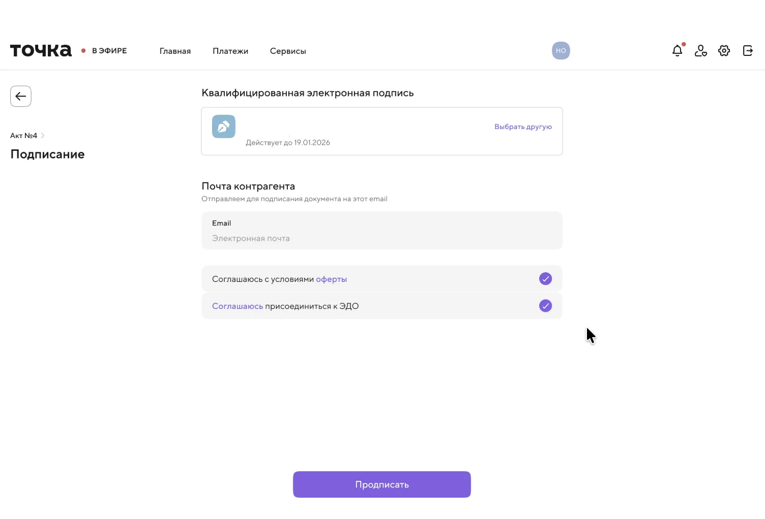 Подписание происходит с помощью электронной подписи с обеих сторон — она придаёт документу полную юридическую силу.