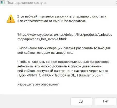 - При переходе плагин попросит доступ к сертификатам.