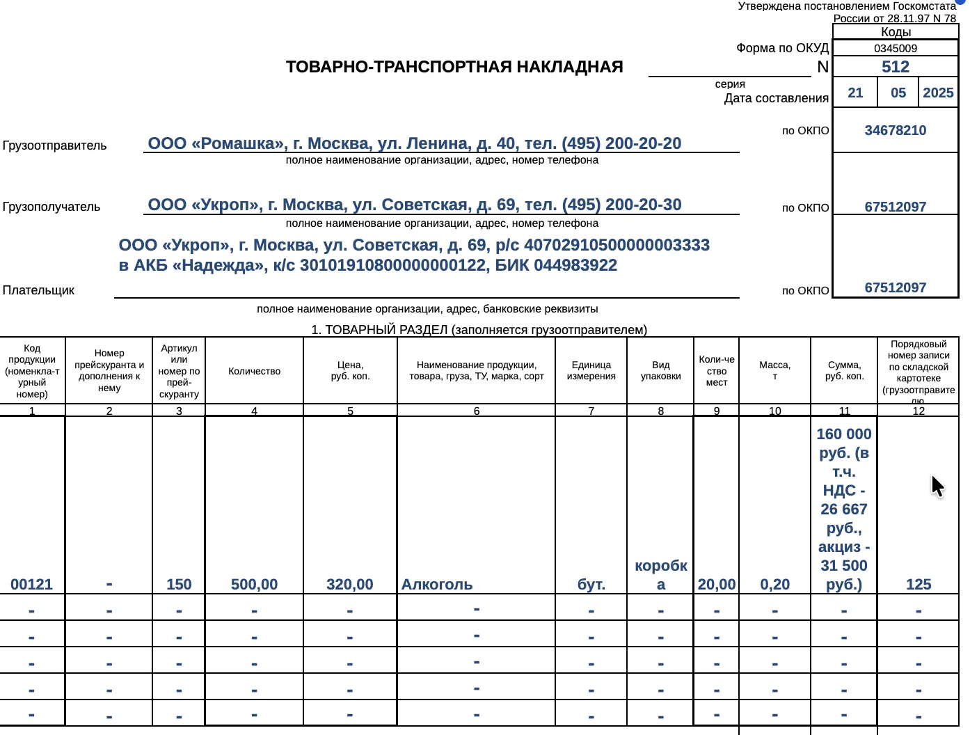 При перевозке алкоголя ТТН по форме №1-Т обязательна. В таком случае документ оформляют на каждого грузополучателя и на каждую отдельную доставку.