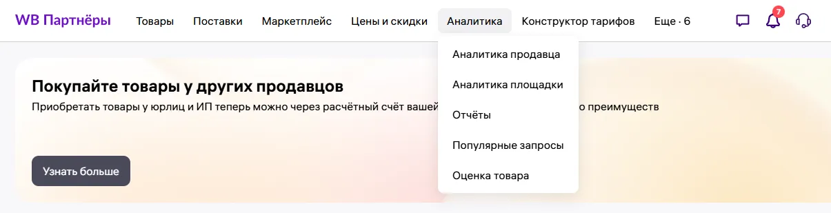Аналитику воронки Wildberries можно посмотреть в личном кабинете: «Аналитика» — «Аналитика продавца».