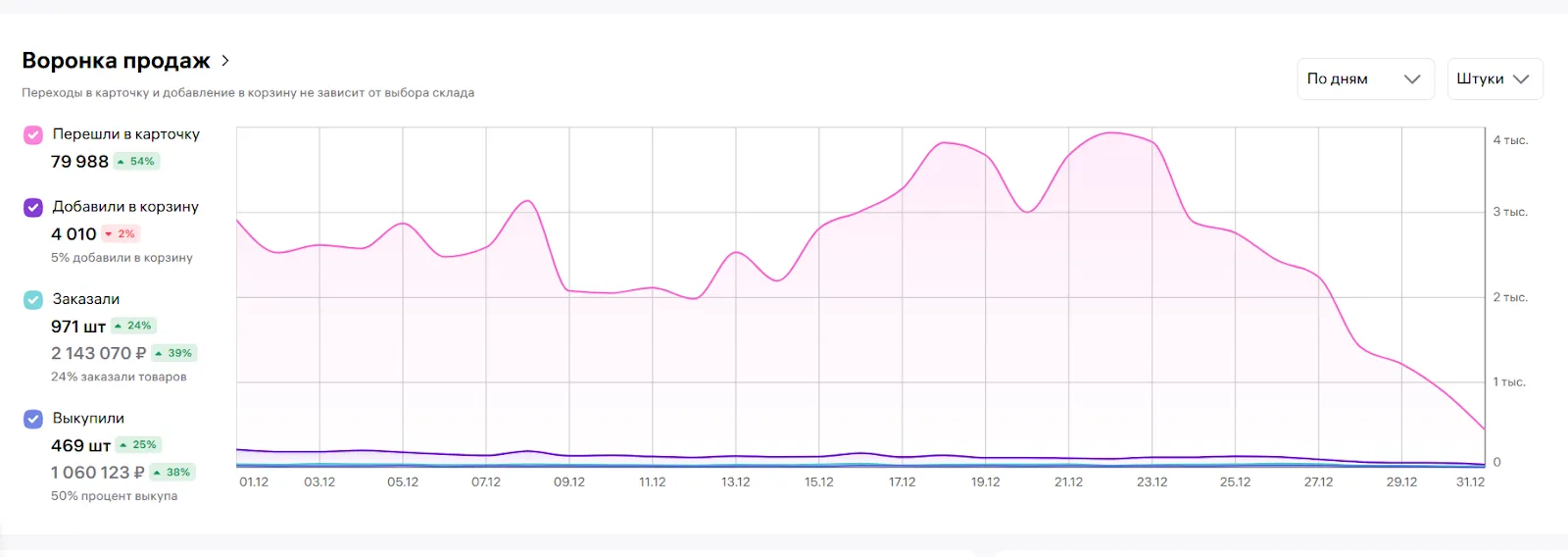 В левой части страницы столбиком перечислены действия клиентов. Можно посмотреть, сколько людей перешли в карточку, добавили товар в корзину, заказали и выкупили. Справа рисуется график за месяц, где отображаются данные суммарно по всем товарам на WB. Чтобы сузить выборку, можно выставить фильтры: по предмету, бренду, артикулу или ярлыкам.
