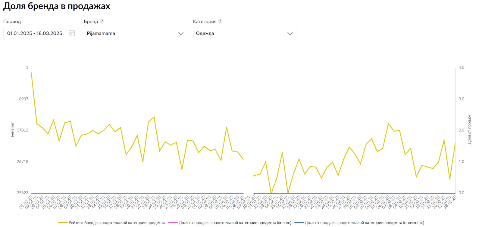 На графике можно посмотреть долю одного бренда от общей выручки, долю бренда от продаж в категории поставщиков и рейтинг за неделю среди всех брендов. Для этого выберите период, бренд и категорию.