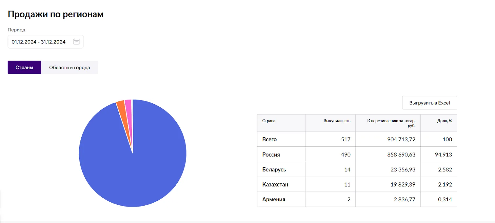 Отчёт «Продажи по регионам» показывает, как товар продаётся в разных странах и разных регионах России.
