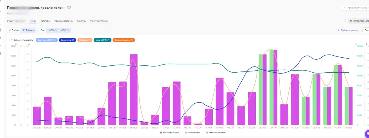 График продаж подвесного кресла. Сервис «Автоматическое продвижение на WB»