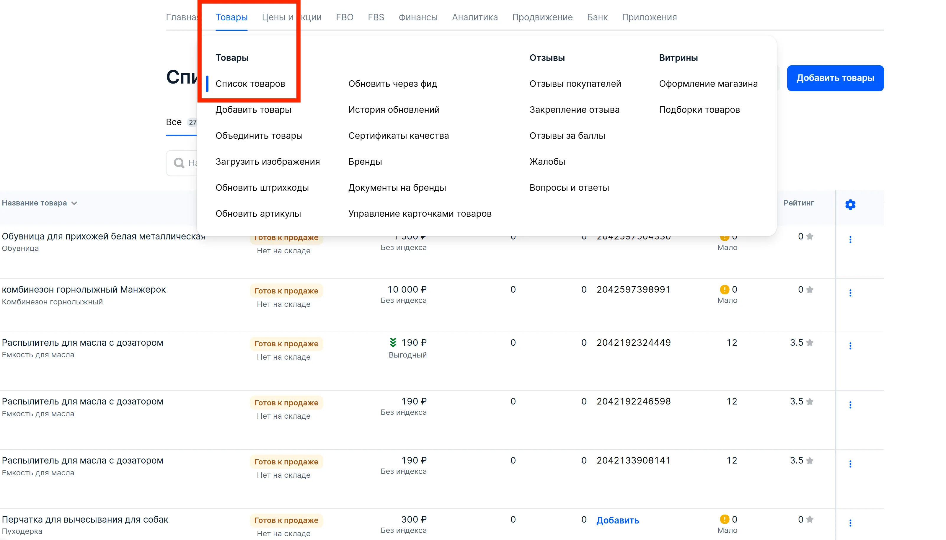 1. Зайдите в личном кабинете в раздел «Товары» и выберите «Список товаров».