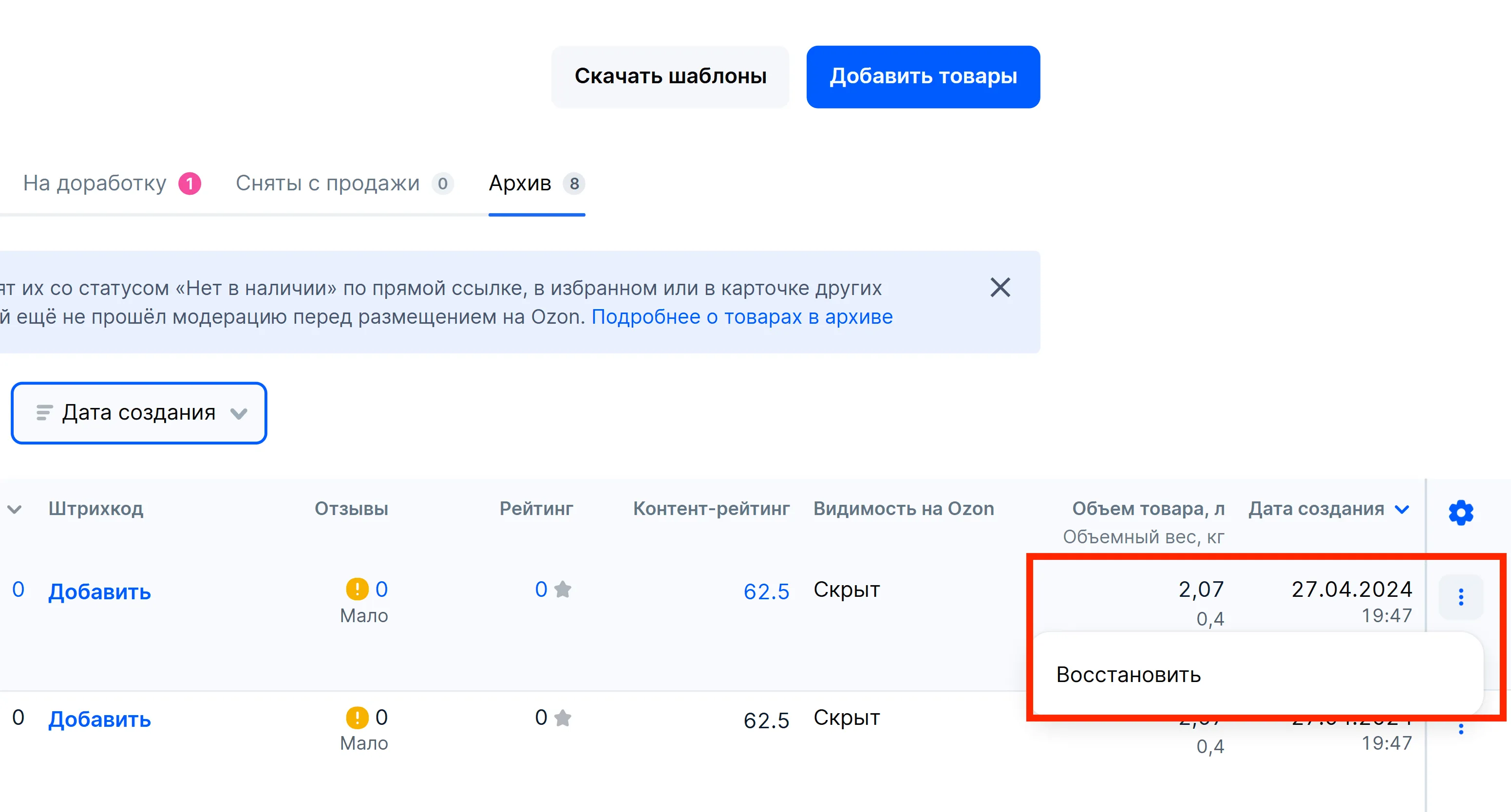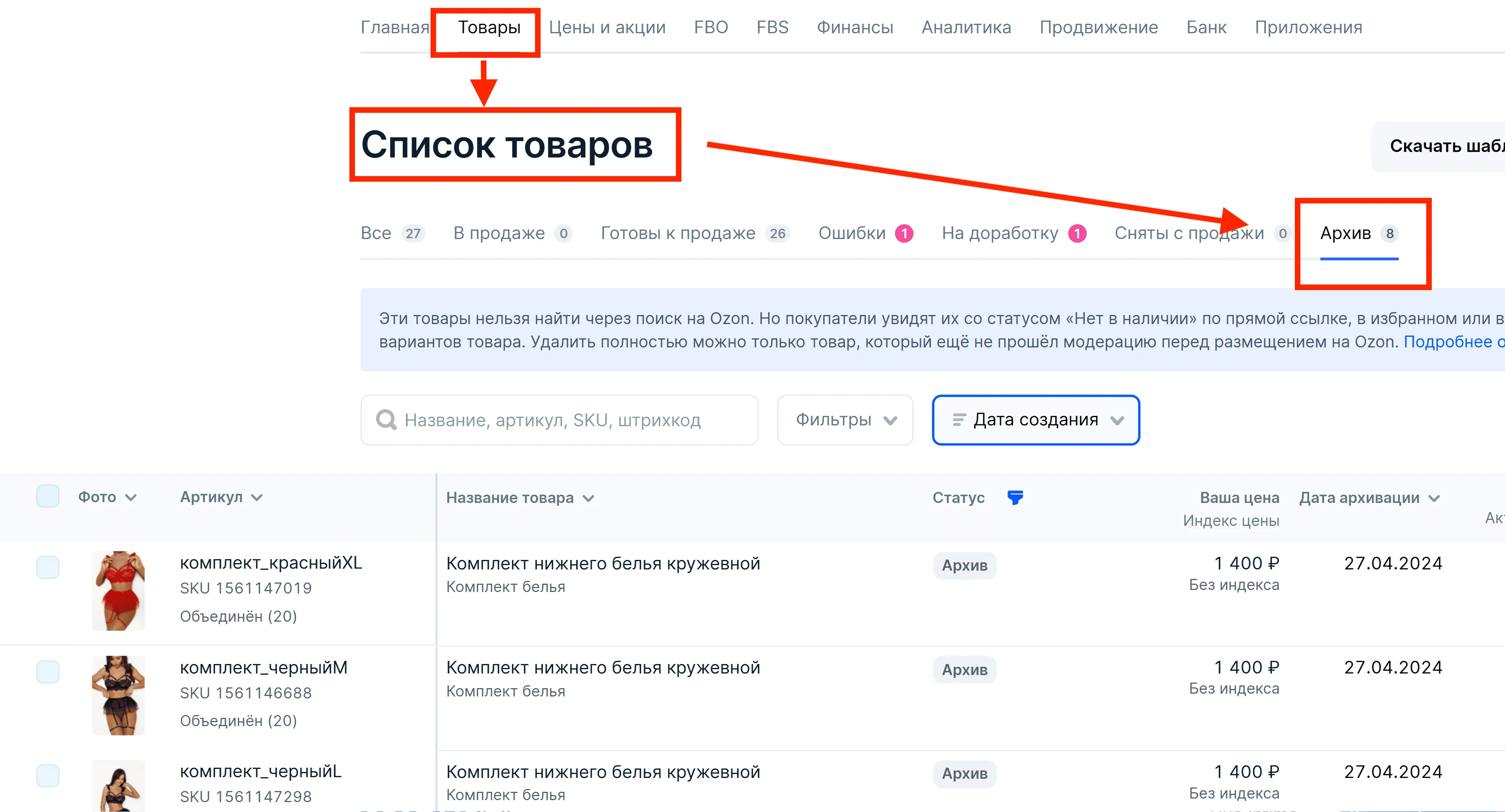 Если продавец перенёс товар в архив или Озон скрыл карточку автоматически, её можно восстановить.