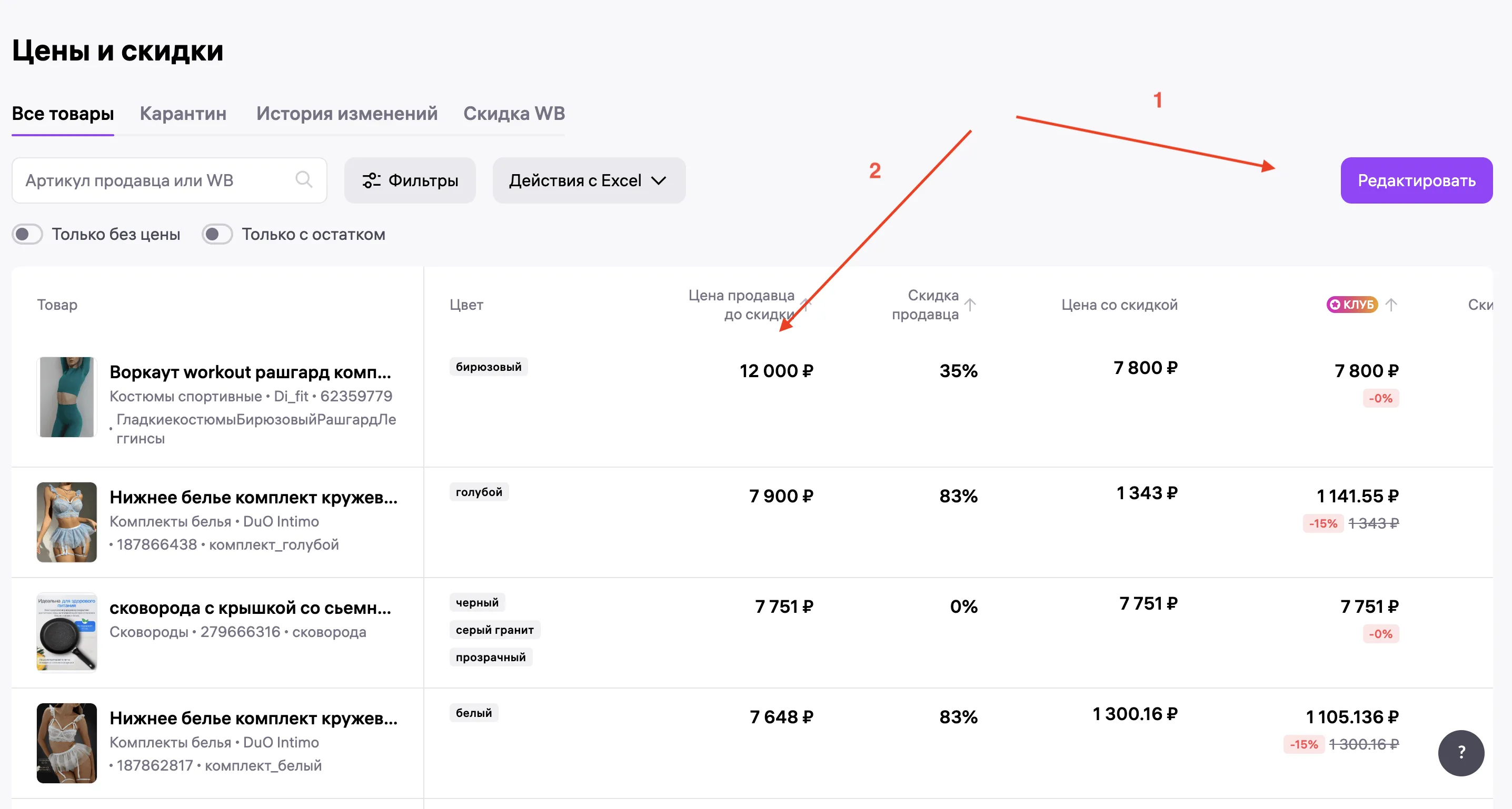 1. Вручную, если надо изменить цену в карточке одного или нескольких товаров. Зайдите в личный кабинет → блок «Товары и цены» → «Управление ценами» → нажмите «Редактировать» и отредактируйте цены и скидки прямо в таблице.