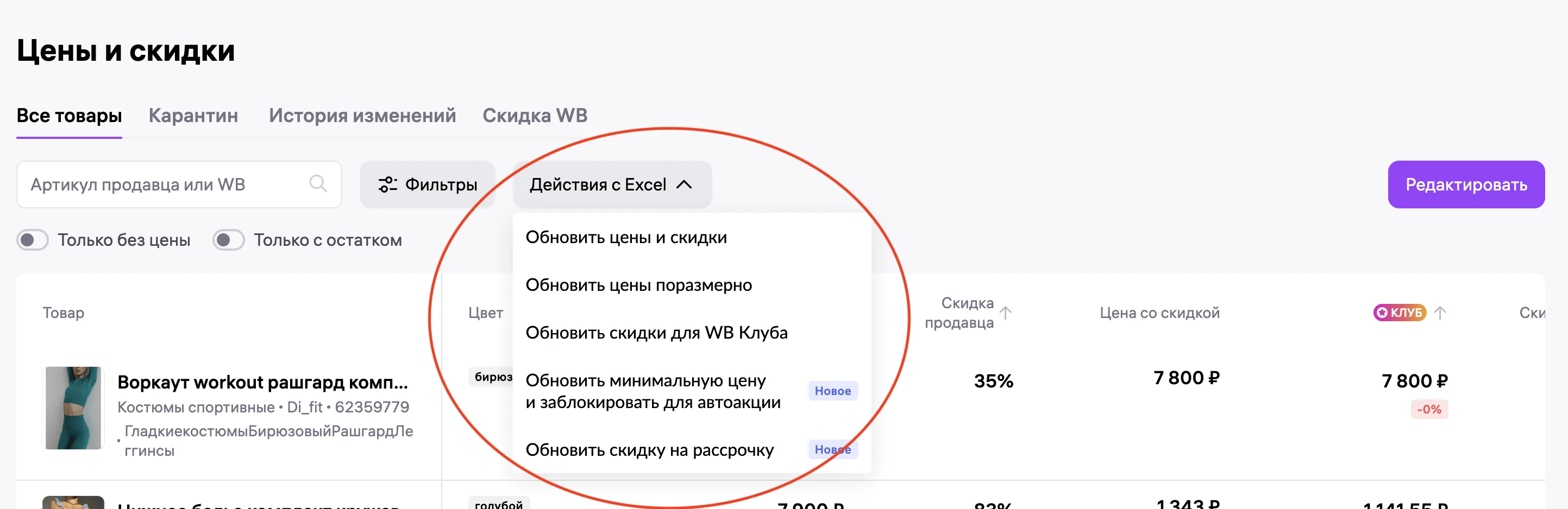 В том же разделе «Управление ценами» выберите «Обновить цены и скидки» или «Обновить цены поразмерно» — в зависимости от того, какие цены хотите изменить. Также тут можно установить минимальные цены на товары, управлять автоматическими акциями и менять скидки для WB-клуба.