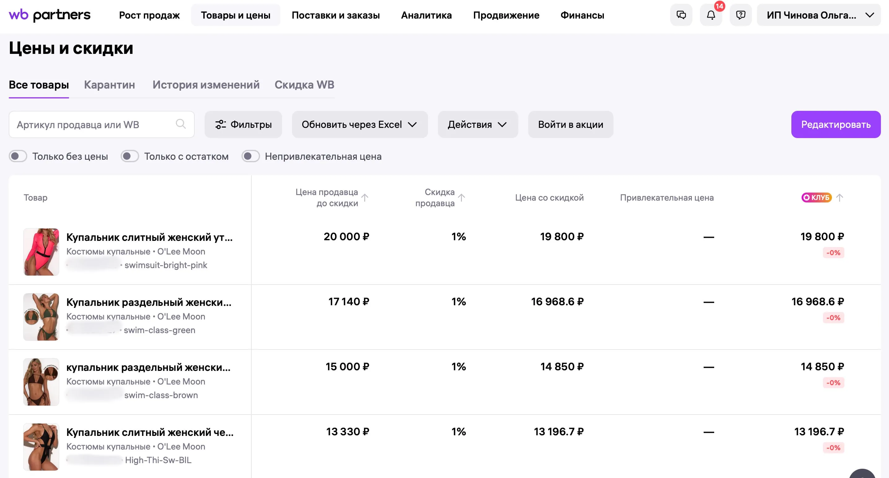 В «Управлении ценами» вы найдёте весь список позиций с ценами. Здесь можно вручную менять стоимость каждого товара, устанавливать скидки или загружать все данные одним файлом, подключаться к акциям.