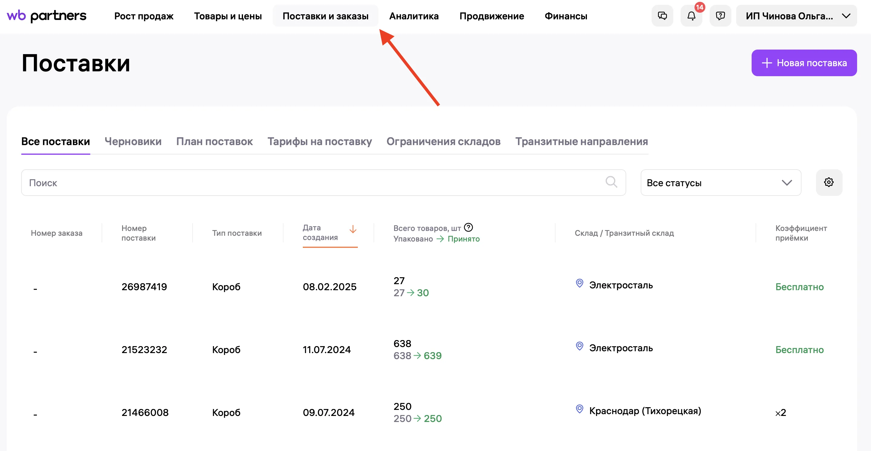 Показывает последние поставки: количество товаров, название склада, дату поставки и статус приёмки.