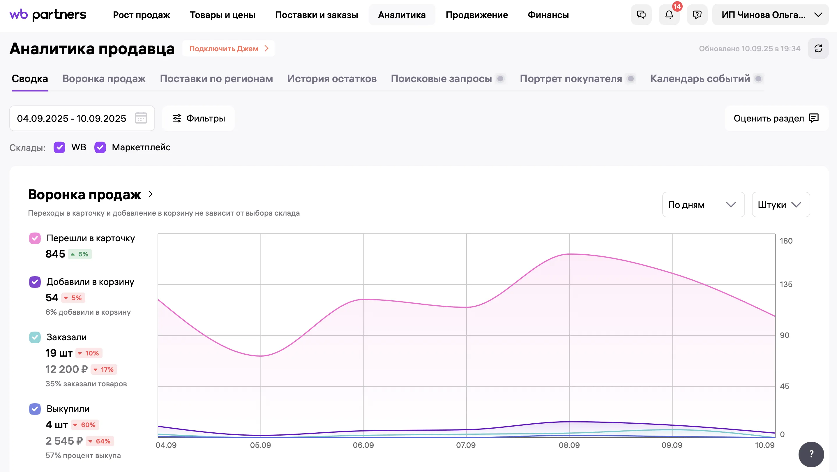 Здесь хранятся основные метрики по воронке продаж с конверсией по каждому этапу, поставки по регионам и история остатков. Некоторые отчёты, например «Аналитика площадки», доступны только по подписке «Джем».