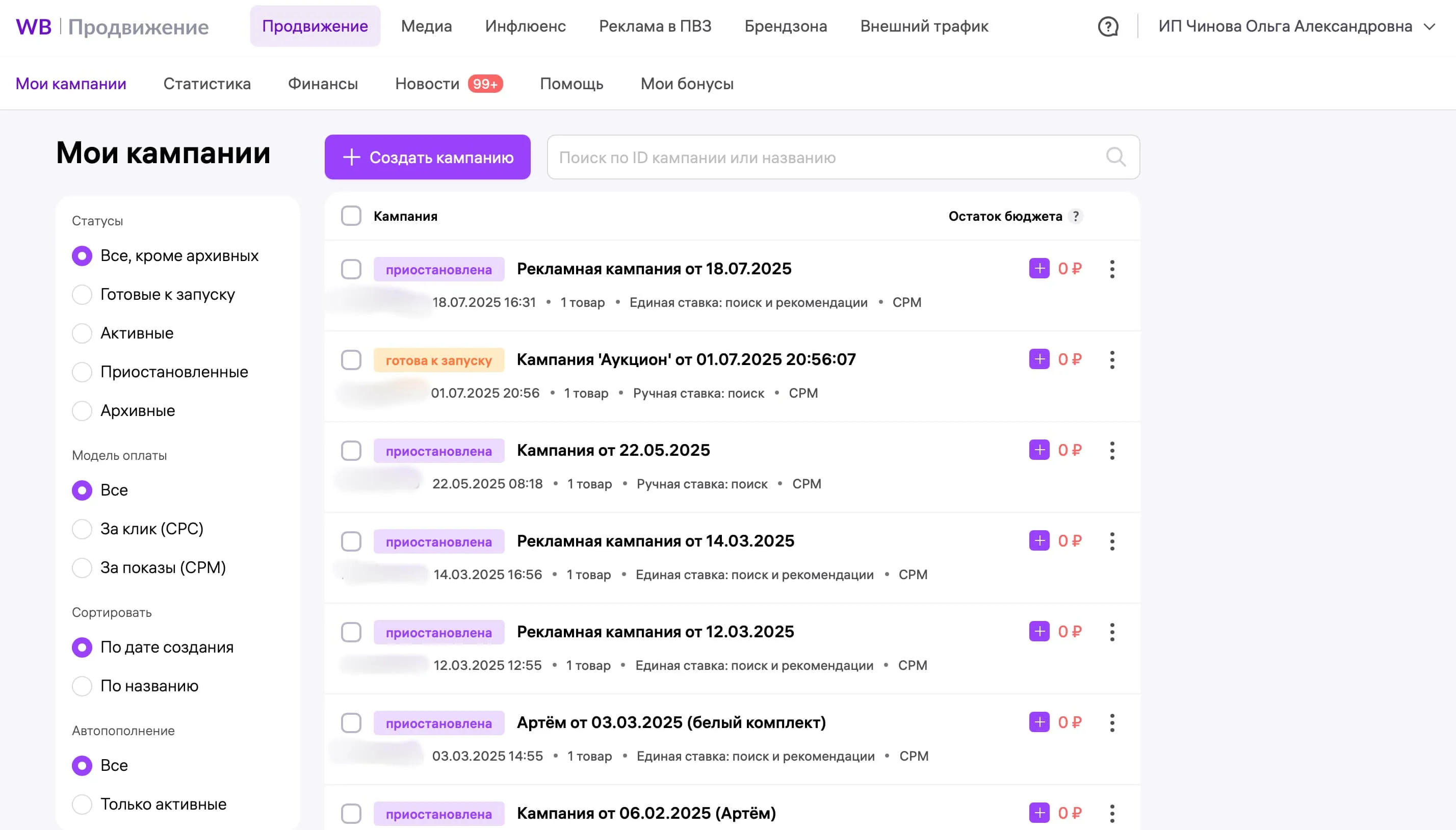 Напротив каждой рекламной кампании указан её статус: «приостановлена», «готова к запуску»