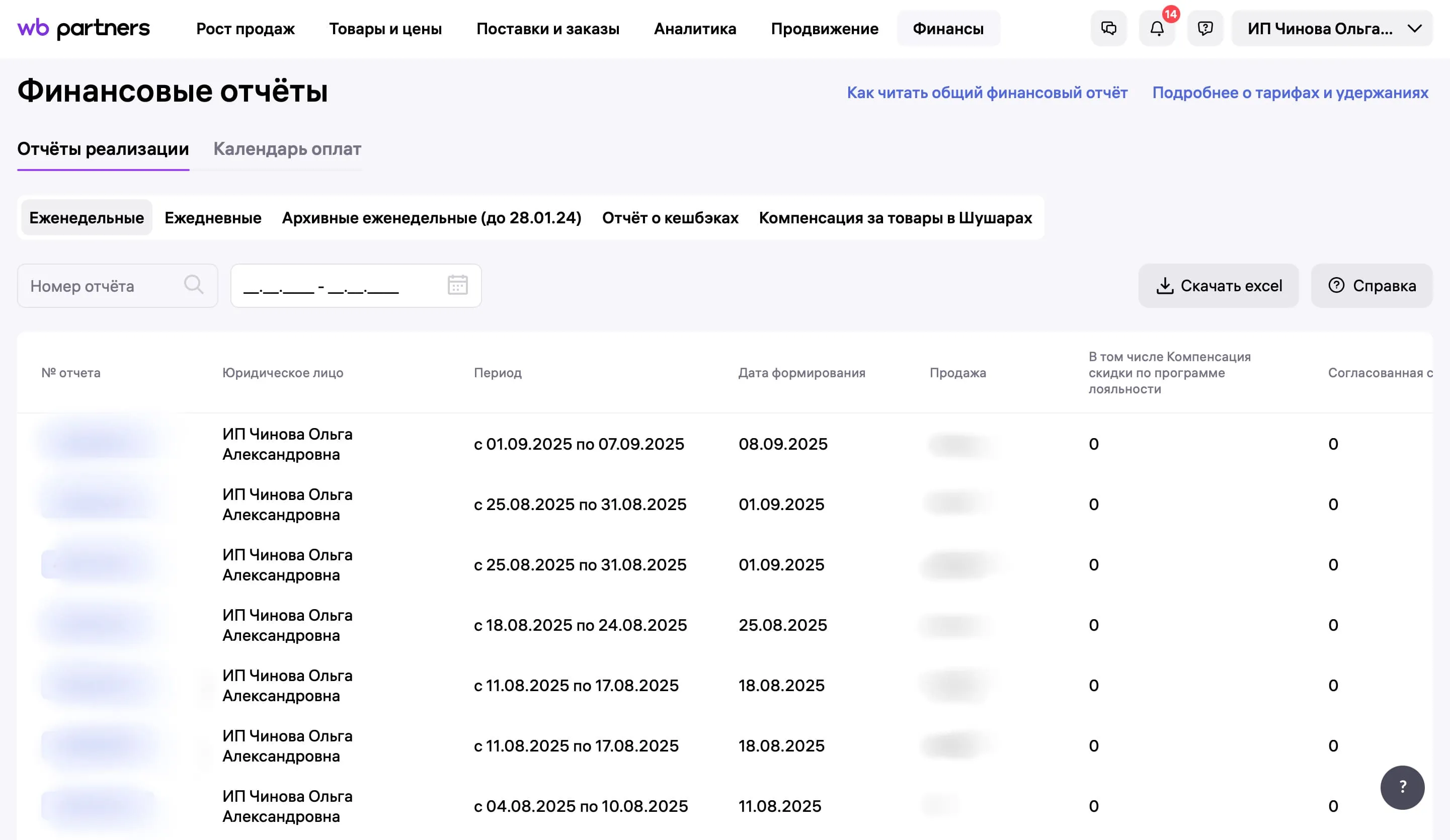 Здесь хранятся финансовые отчёты. Вы можете посмотреть, сколько товаров продали за день, неделю и месяц, и выгрузить эти данные в формате XLS.