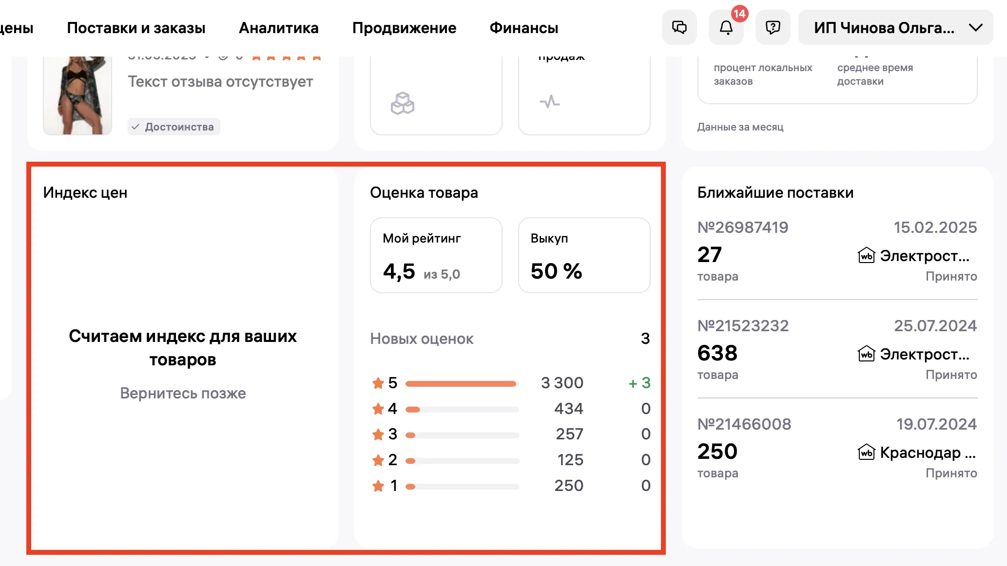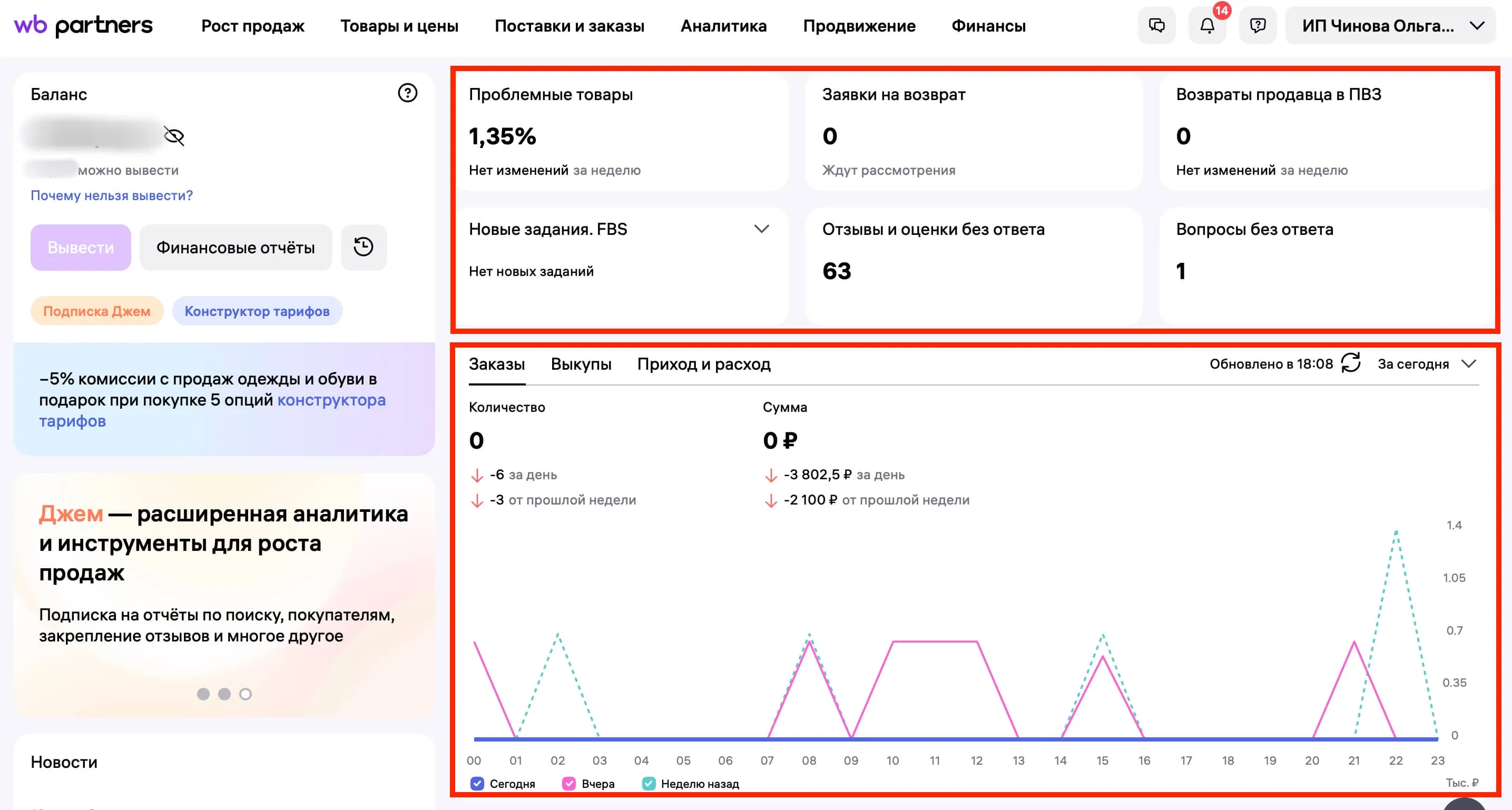 Здесь отображаются основные показатели аналитики: проблемные товары, заявки на возврат, возвраты продавца в ПВЗ, отзывы без оценки, вопросы от пользователей, количество заказов и выкупов, приход и расход с учётом списаний.