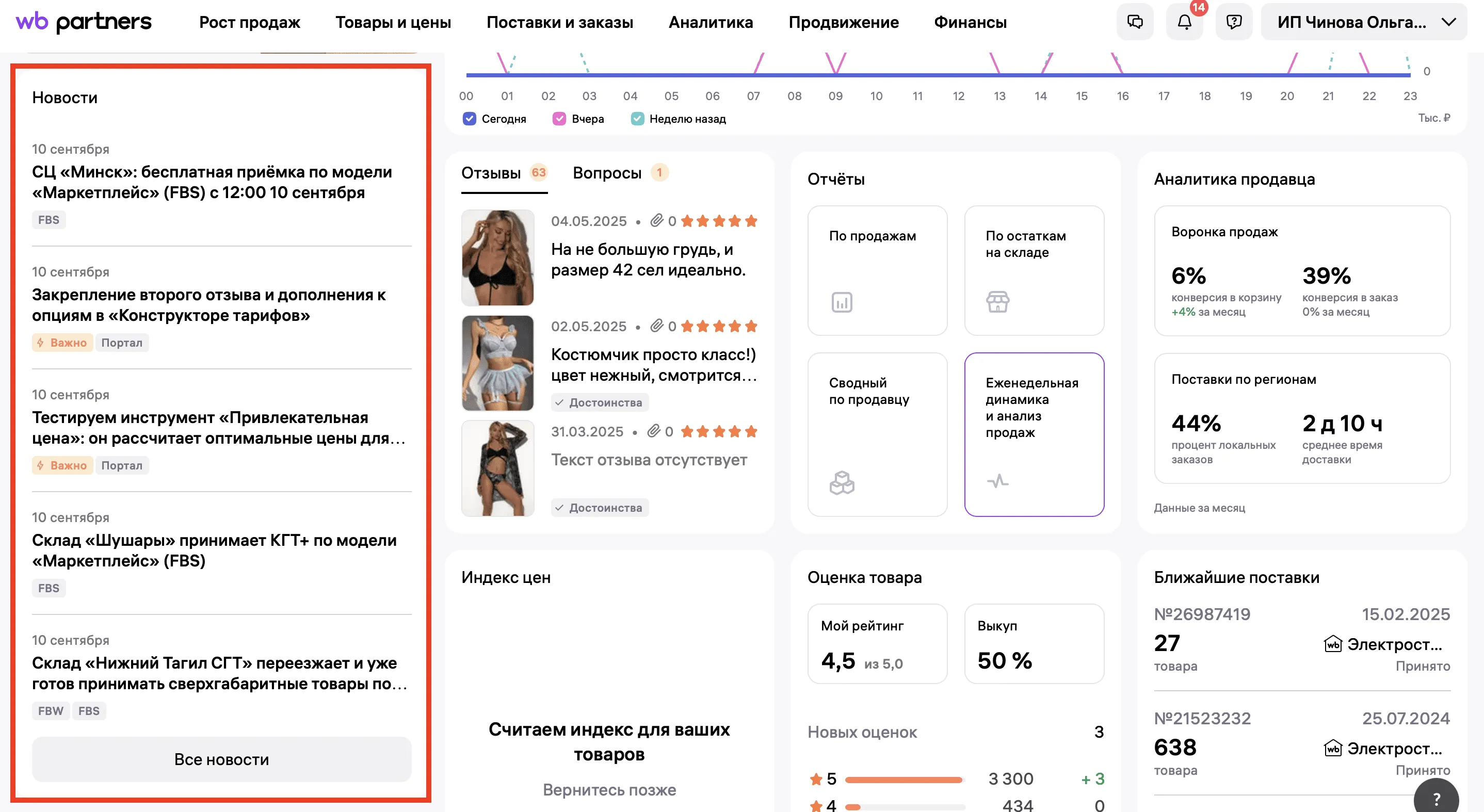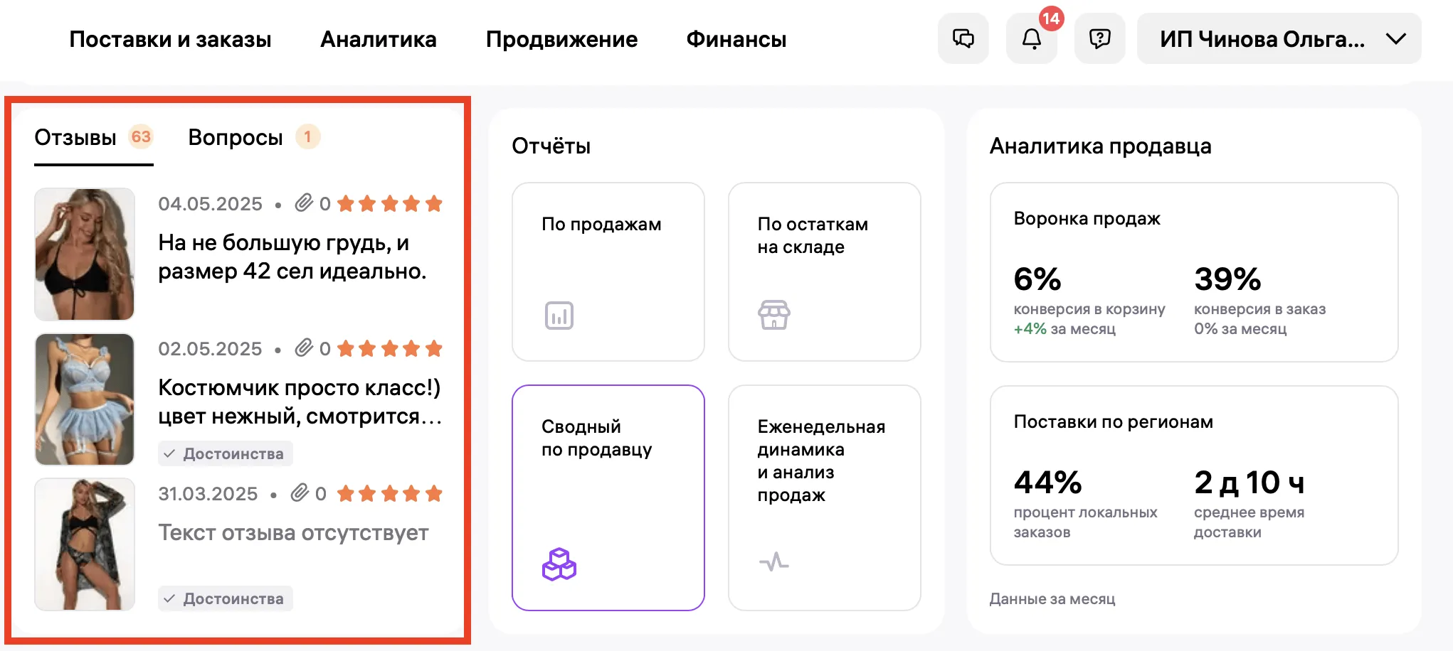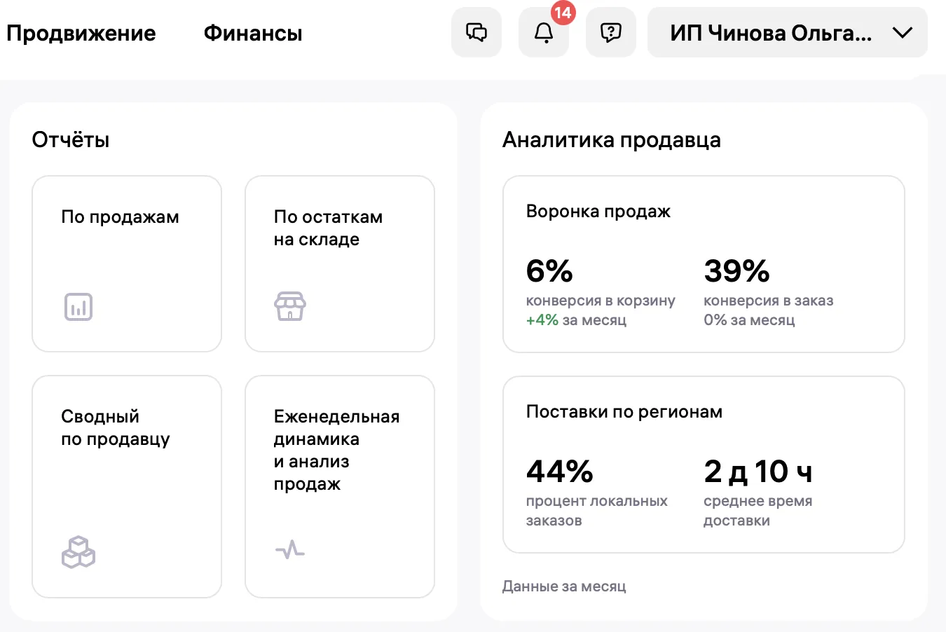 На дашборде можно посмотреть ключевые аналитические показатели продавца: конверсию в корзину и в заказ, процент локальных заказов и среднее время доставки.