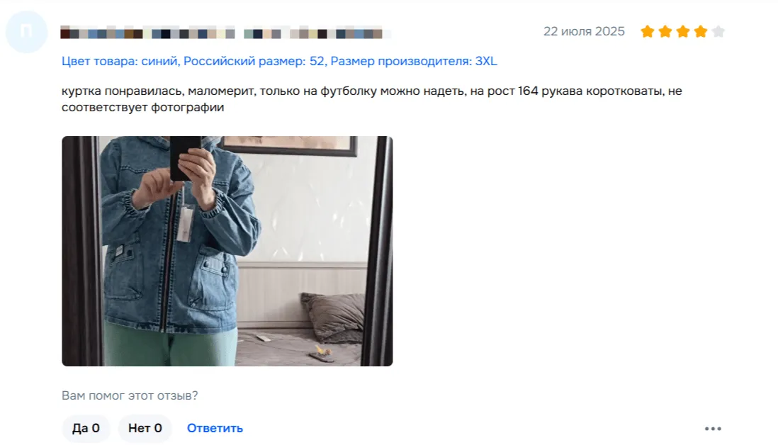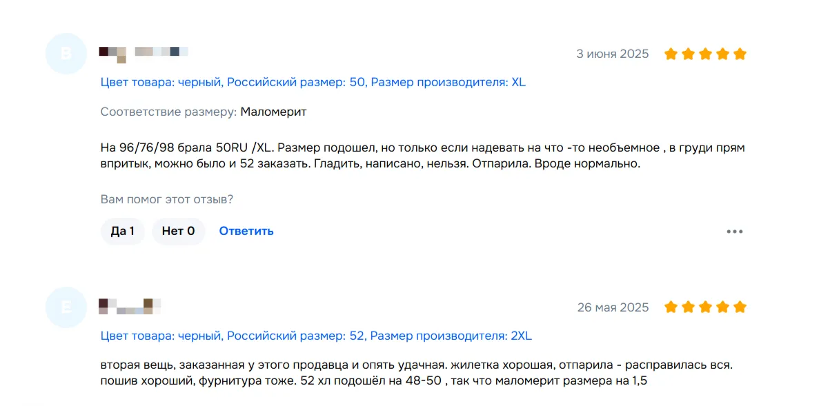 Перед оформлением заказа уделите время анализу отзывов. Покупатели часто указывают: «беру обычно М, здесь взял XL — сидит вплотную» или «длина на 10 см короче заявленной», «маломерит на два размера».