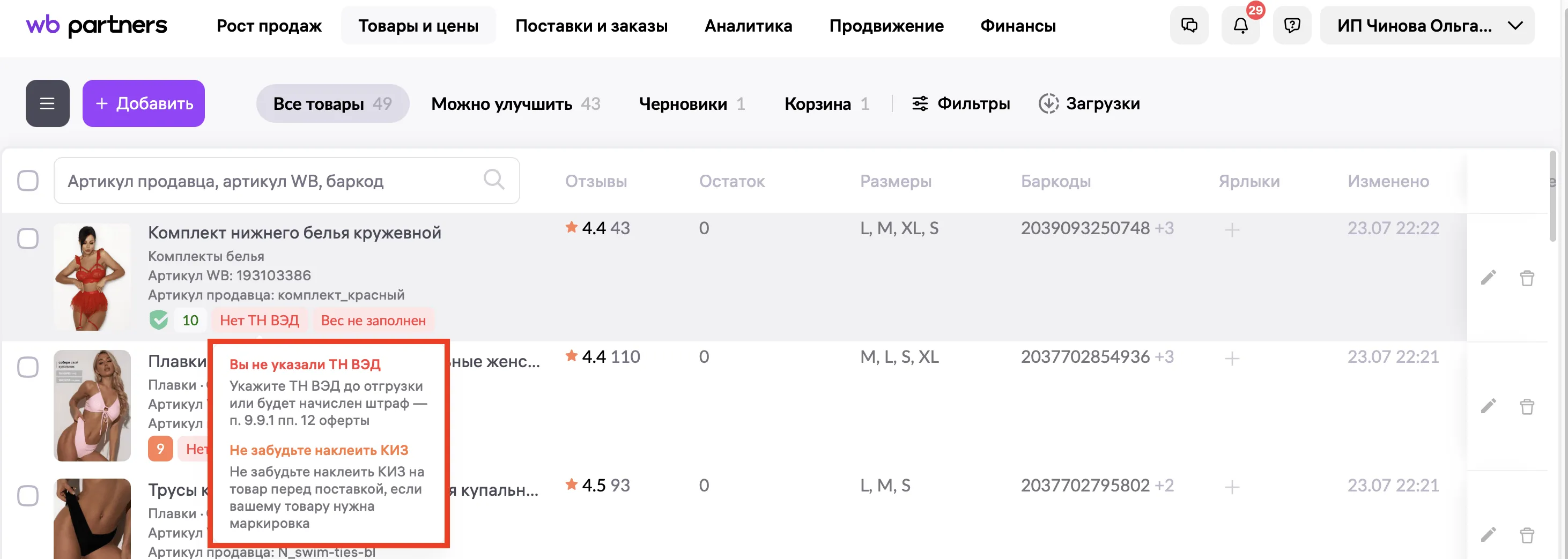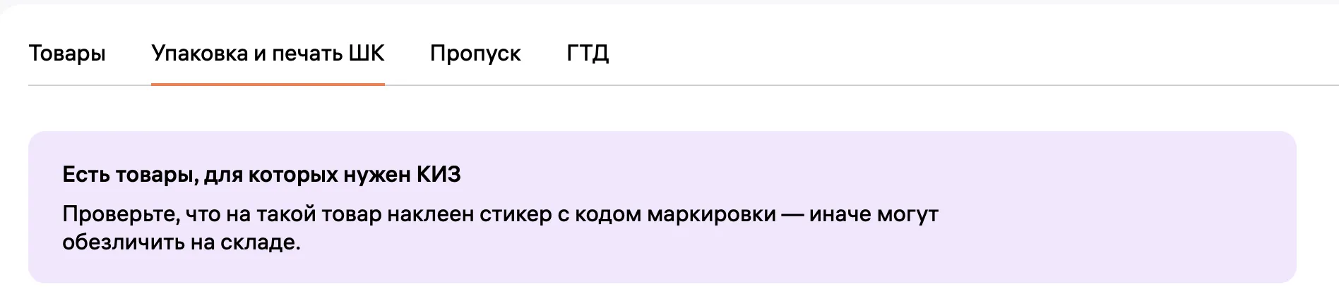 Перед отправкой убедитесь, что наклейки с кодом «Честного знака» нанесены на все коробки или пакеты. Сотрудники Wildberries проверяют наличие этикеток и не примут товары без них. Иначе маркетплейс оштрафуют, если контролирующие органы обнаружат, что продажи идут без обязательной маркировки товаров. Если партию не примут, продавец будет оплачивать возврат из своего кармана.