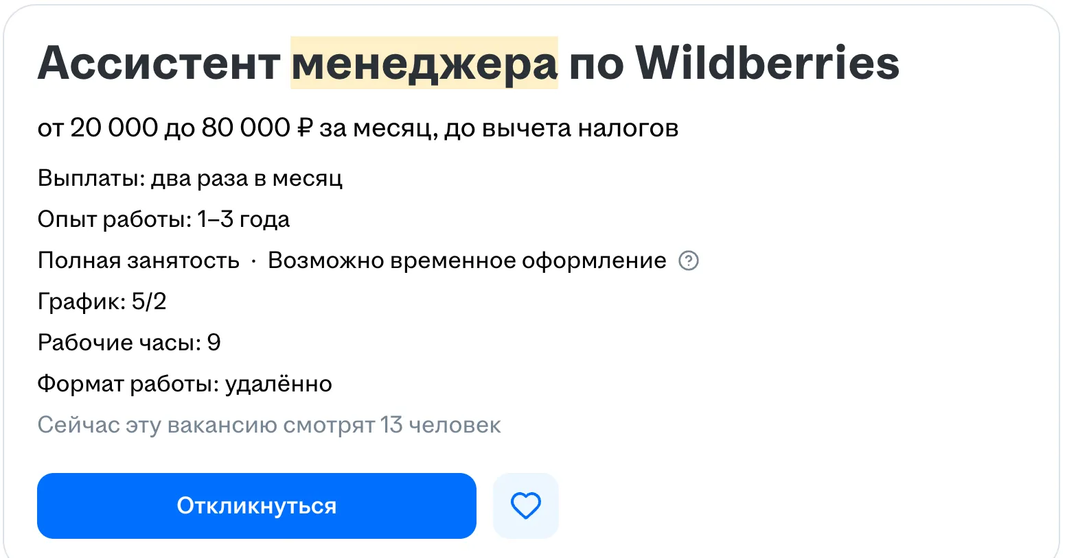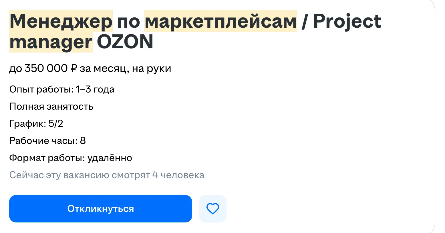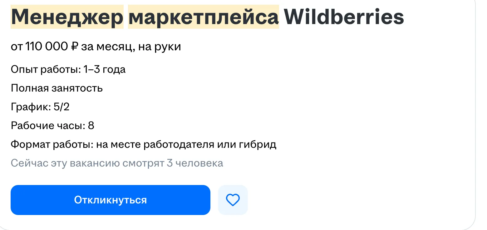 - Выполнение KPI. Это могут быть планы продаж, показатели конверсии, отсутствие штрафов на маркетплейсе. Многие вакансии предлагают доход, включающий в себя оклад и бонусы.