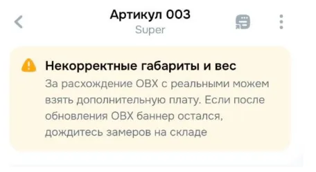 Ozon самостоятельно исправляет ошибки в ОВХ (объёмно-весовых характеристиках с учётом заводской упаковки) товара. Если фактический вес и размер отличаются от указанных в карточке (в бОльшую сторону), селлеру нужно будет заплатить 1500 рублей за корректирование неверной информации.