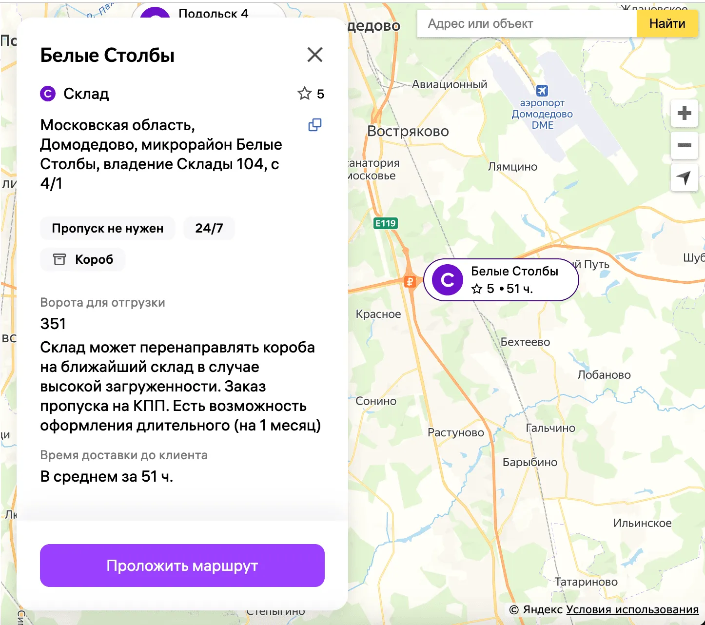 Этот склад отличается удобным расположением из-за близости аэропорта Домодедово, Симферопольского шоссе и МКАДа. Склад в подмосковном Подольске также имеет неограниченную зону покрытия. С этого склада можно отправлять заказы в страны, где есть WB, и в любые города.