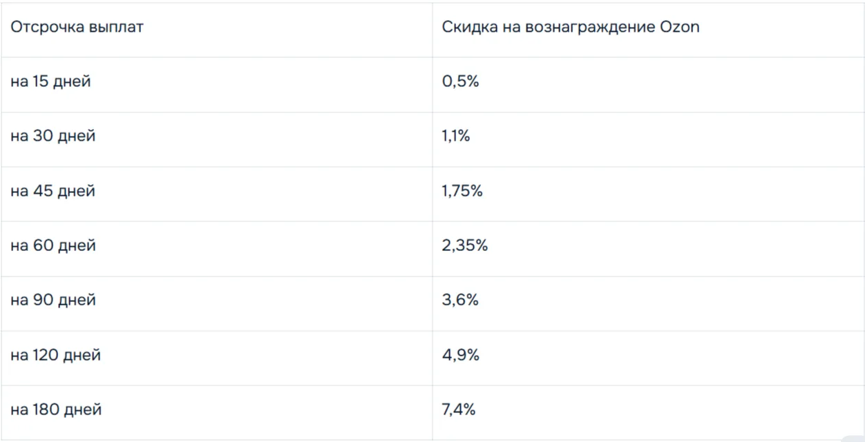 Отсрочка на Ozon позволяет перенести получение заработанных средств на срок от 15 до 180 дней в обмен на снижение комиссии платформы. Например, при стандартной комиссии 10% и отсрочке на 30 дней ставка может снизиться до 8.9%. Услуга применяется ко всем видам выплат за расчётную неделю.