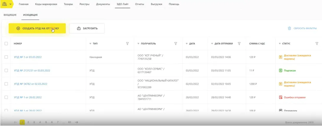 Создать исходящий УПД в ЭДО Лайт можно прямо в личном кабинете «Честного ЗНАКА». Для входа используйте свою электронную подпись.