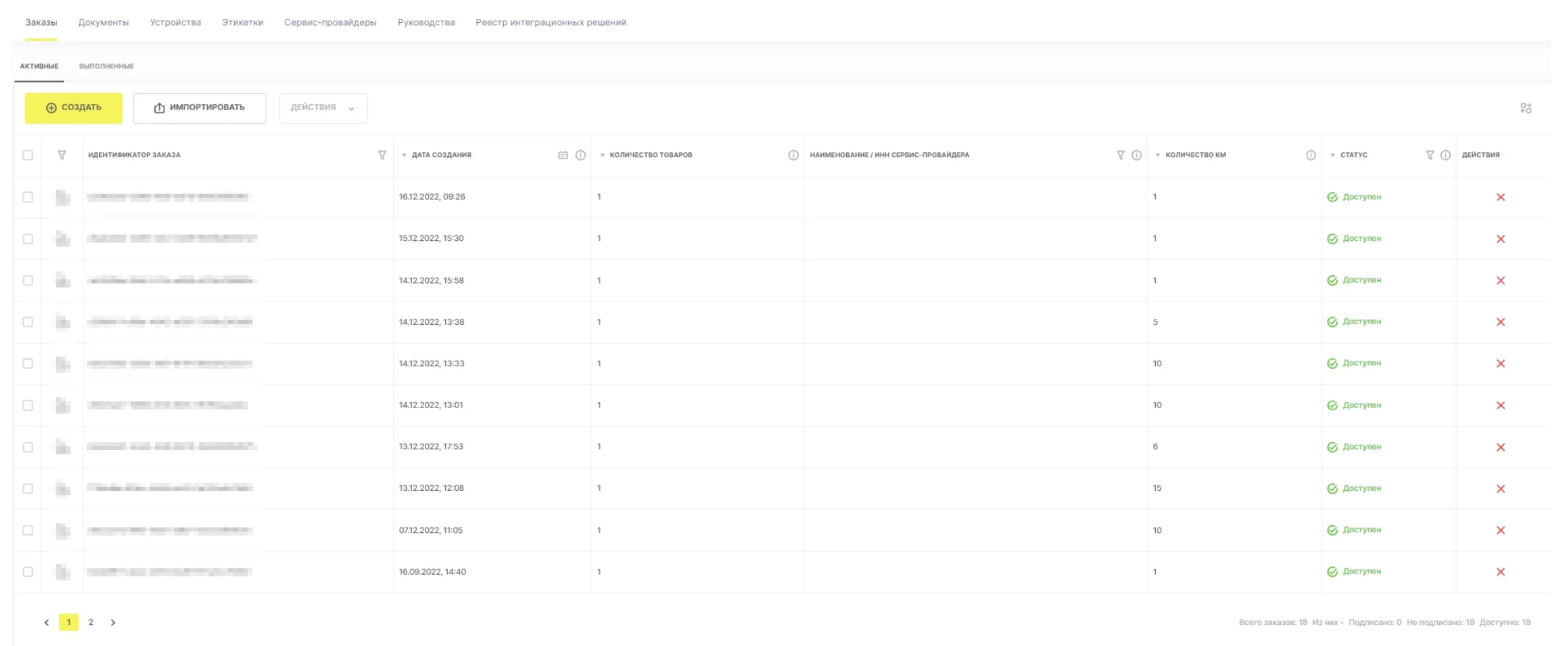 После загрузки заказ появится в разделе «Заказы» — «Активные» со статусом «Создан». Чтобы быстрее его найти, используйте фильтр по статусу в столбце «Статус».