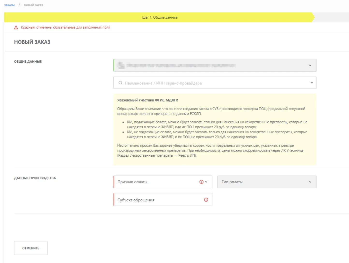 На вкладке «Шаг 1. Общие данные» нужно заполнить все поля. Обязательные поля отмечены красным. Без них система не даст перейти к следующему шагу.