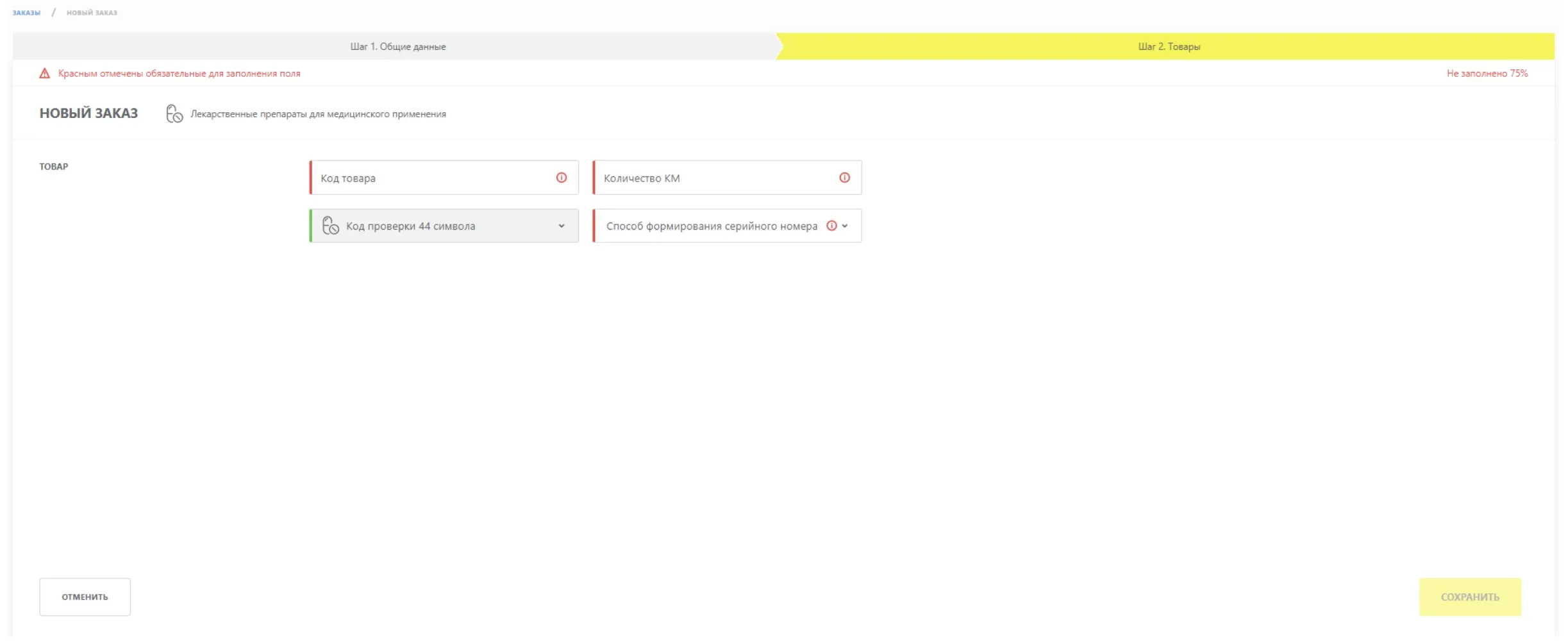 В поле «Код товара» укажите номер GTIN того товара, для которого создаёте заказ. Затем заполните поле «Количество КМ», введя нужное число вручную.