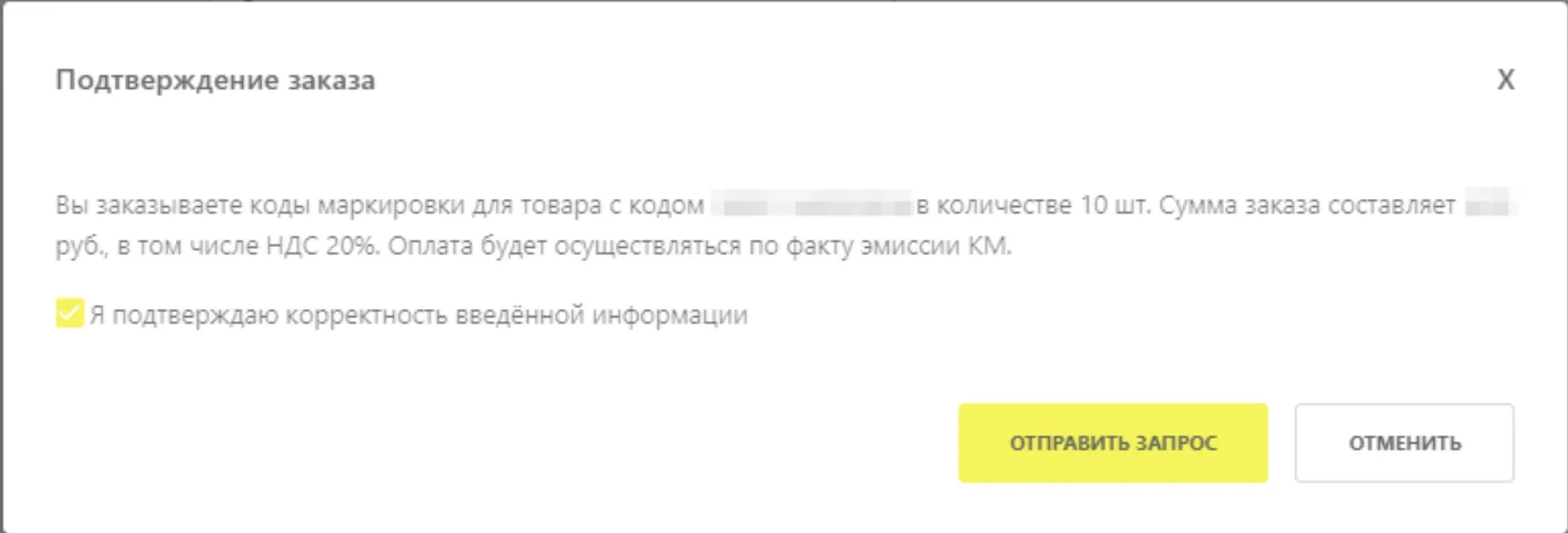Одновременно система автоматически формирует и отправляет отчёт об эмиссии КМ (форма 10300). Если для заказа был выбран способ оплаты «По эмиссии», списание средств произойдёт после получения этого отчёта.