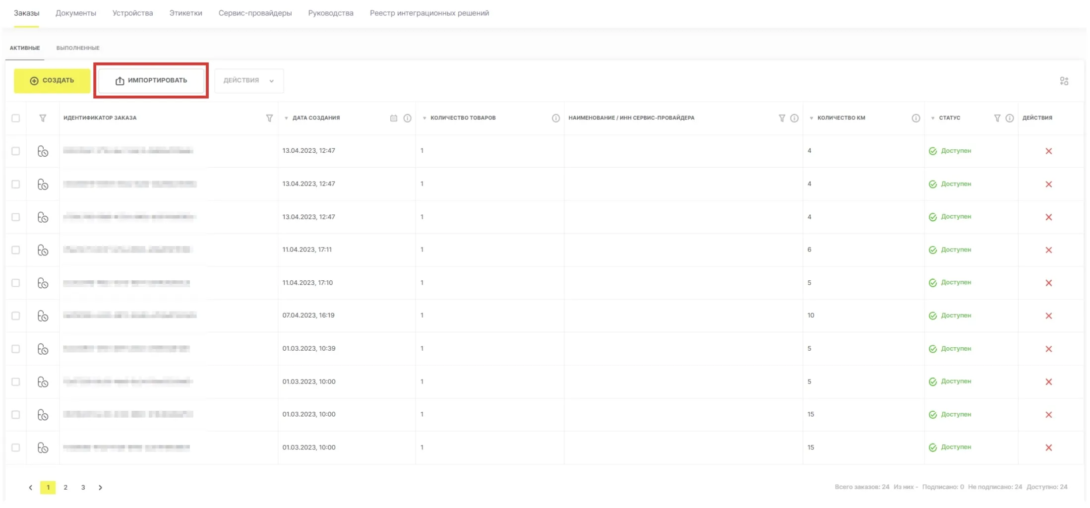 Чтобы загрузить заказ через файл *XML, откройте раздел «Заказы» и перейдите во вкладку «Активные». Затем нажмите кнопку «Импортировать».