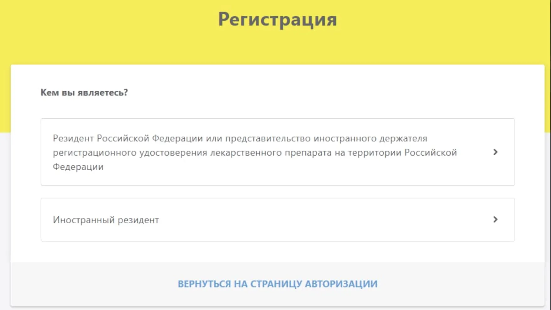 После начала работы с маркированными лекарствами у вас есть 7 календарных дней, чтобы подать заявку на регистрацию. Для этого зайдите на портал и авторизуйтесь. Затем выберите ваш статус — резидент или нерезидент.