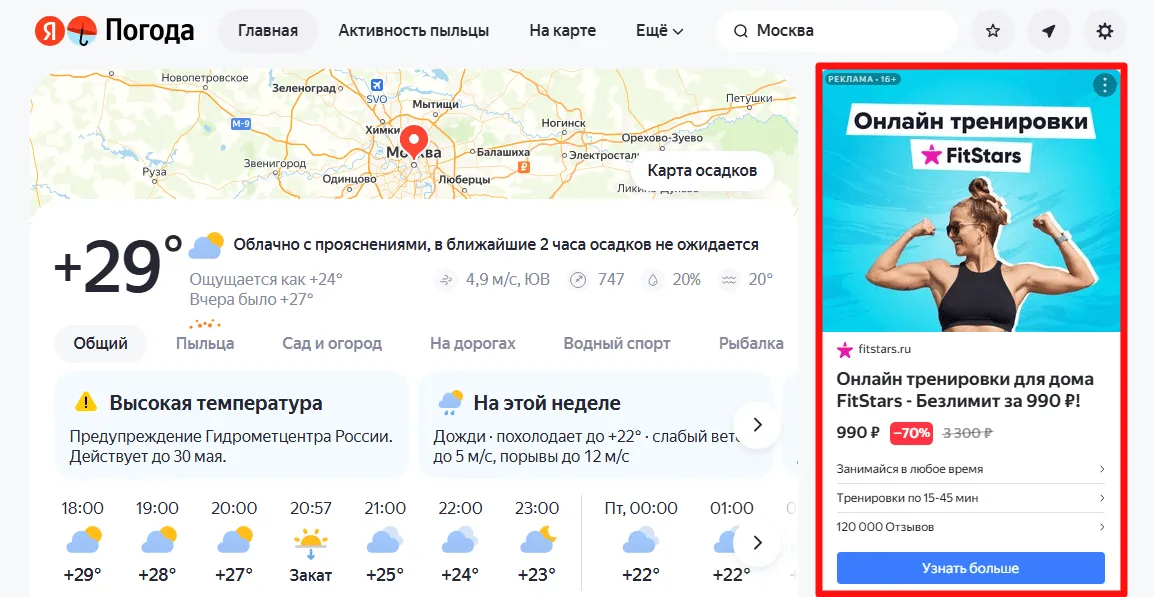 Пример рекламы РСЯ в Яндекс Погоде
